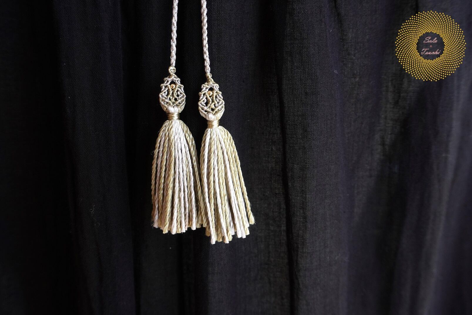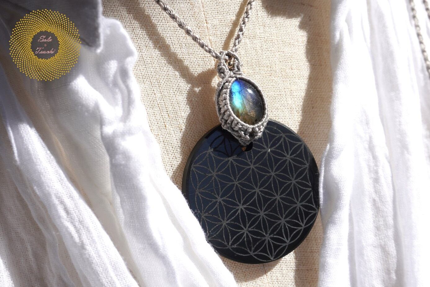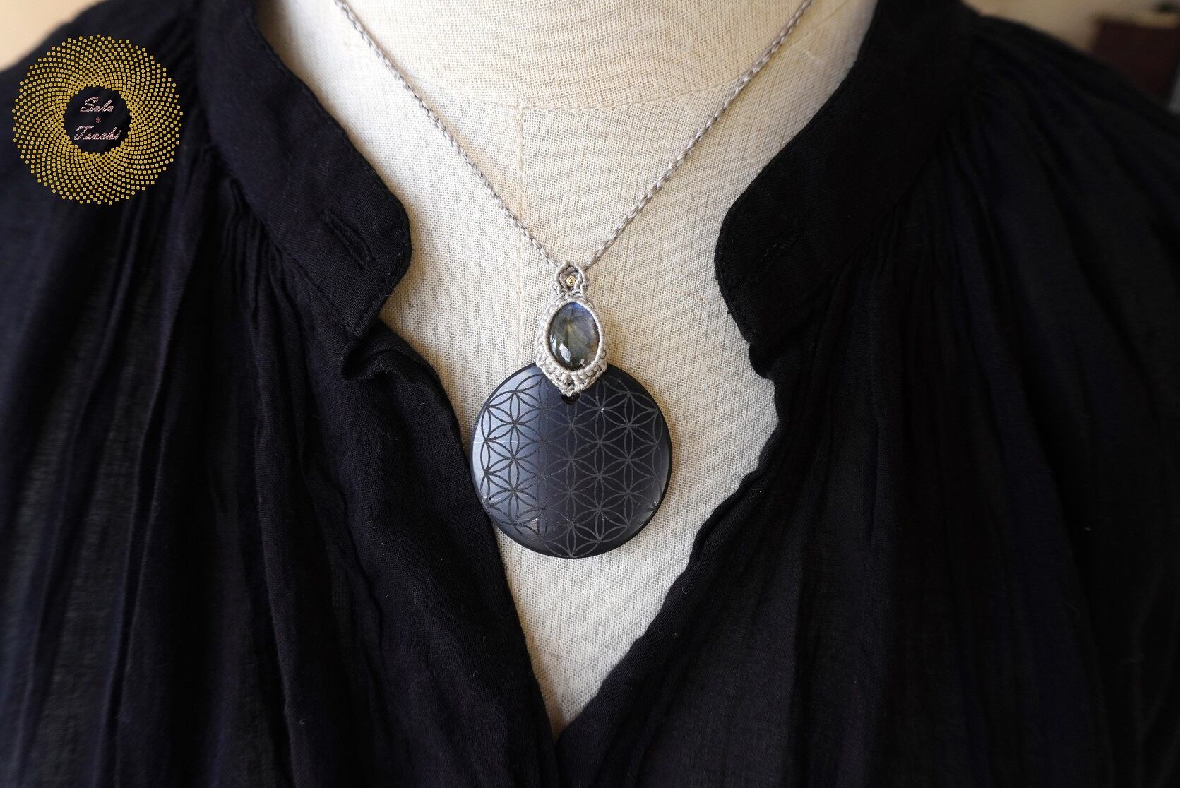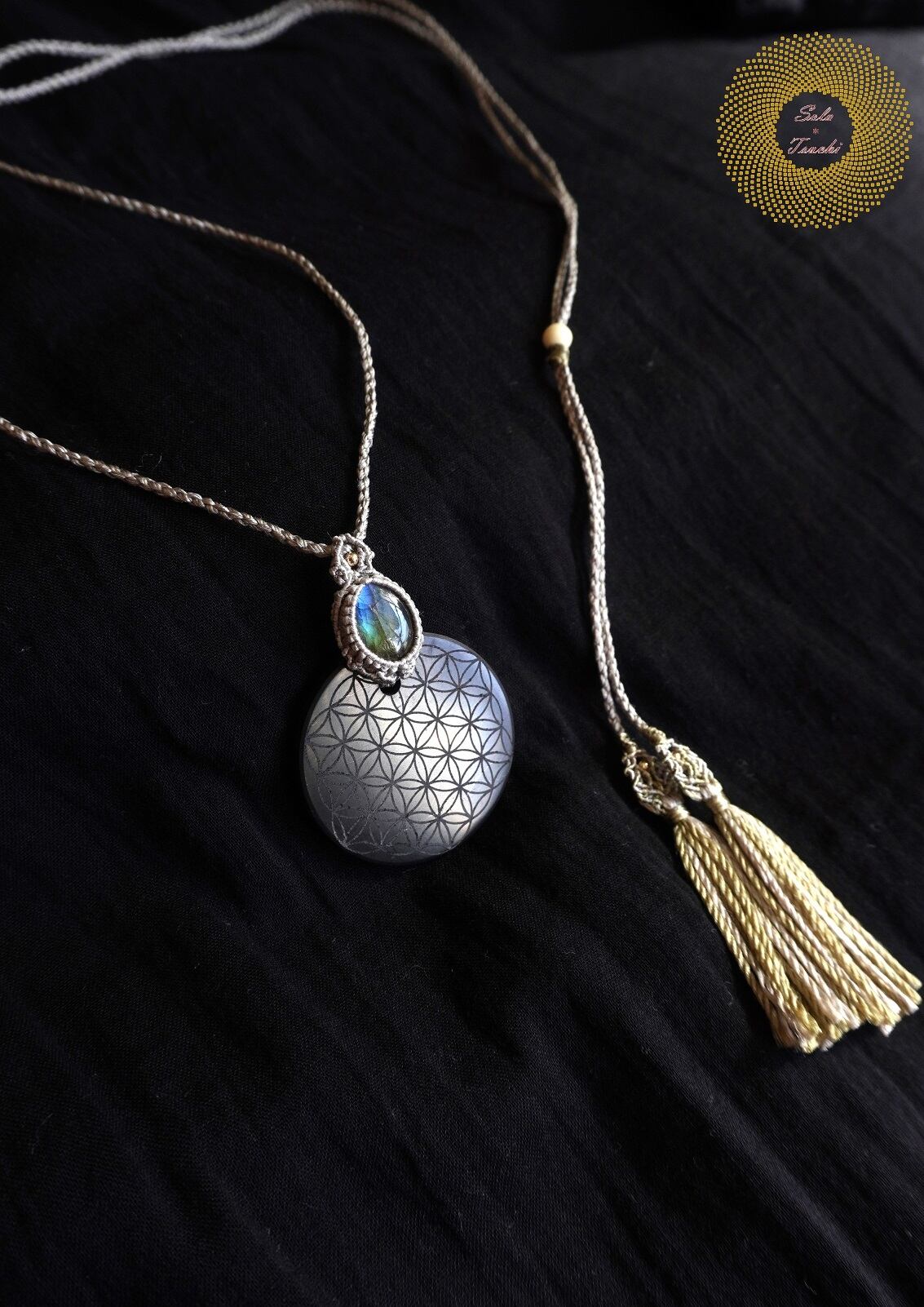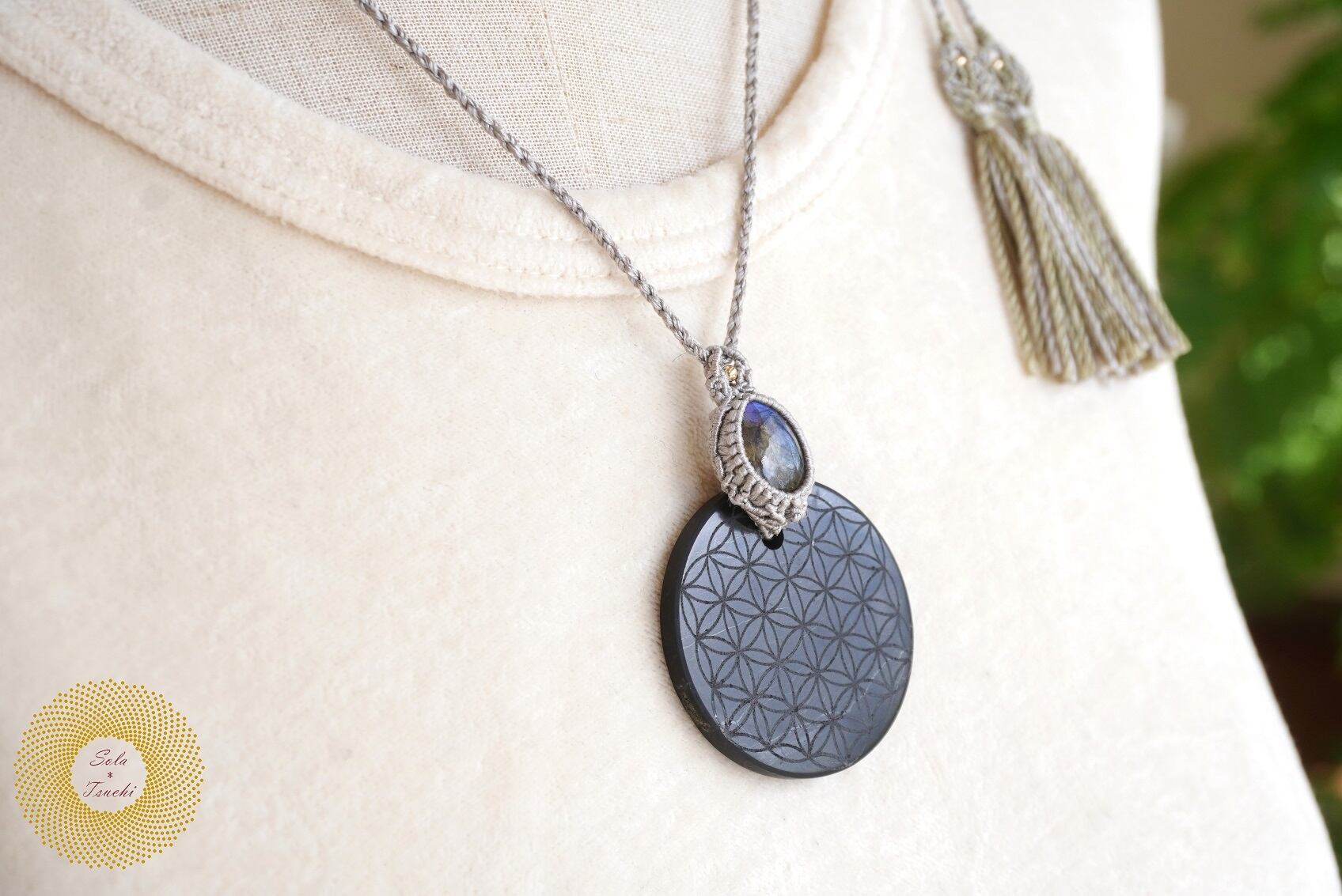 (絹糸)シュンガイトとラブラドライトのマクラメ編みペンダント 〜Flower of Earth〜