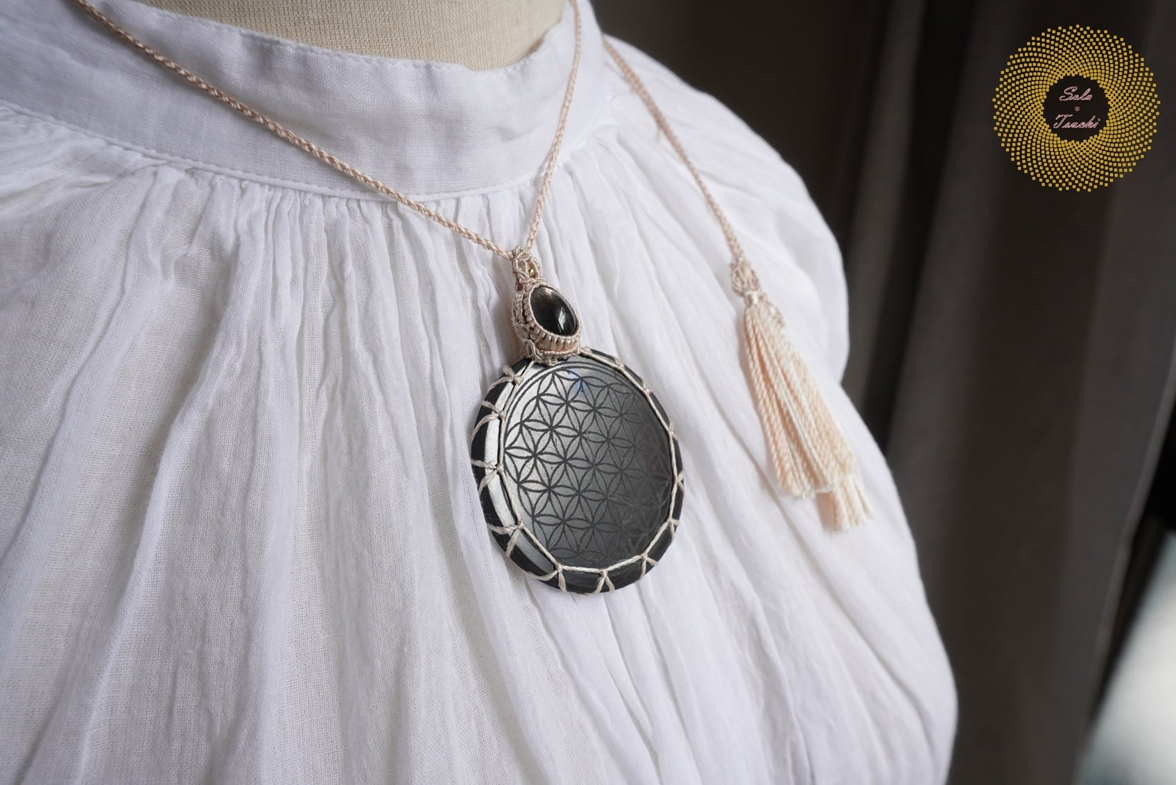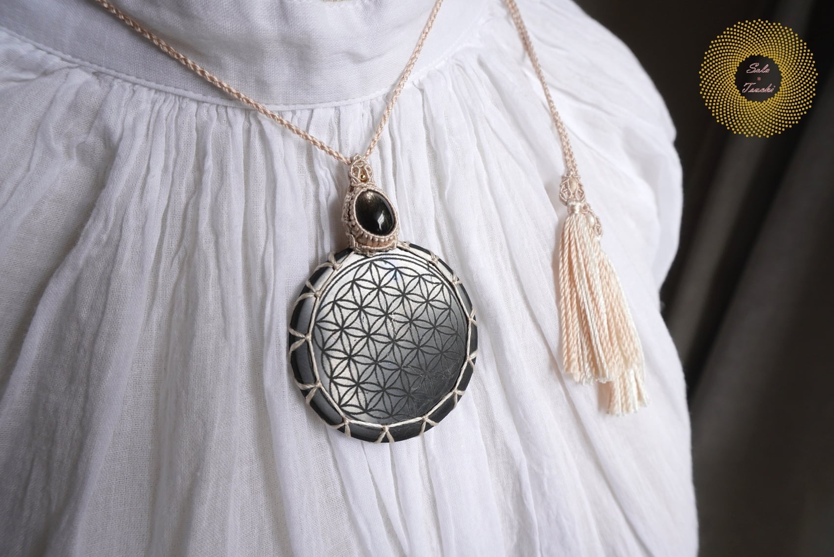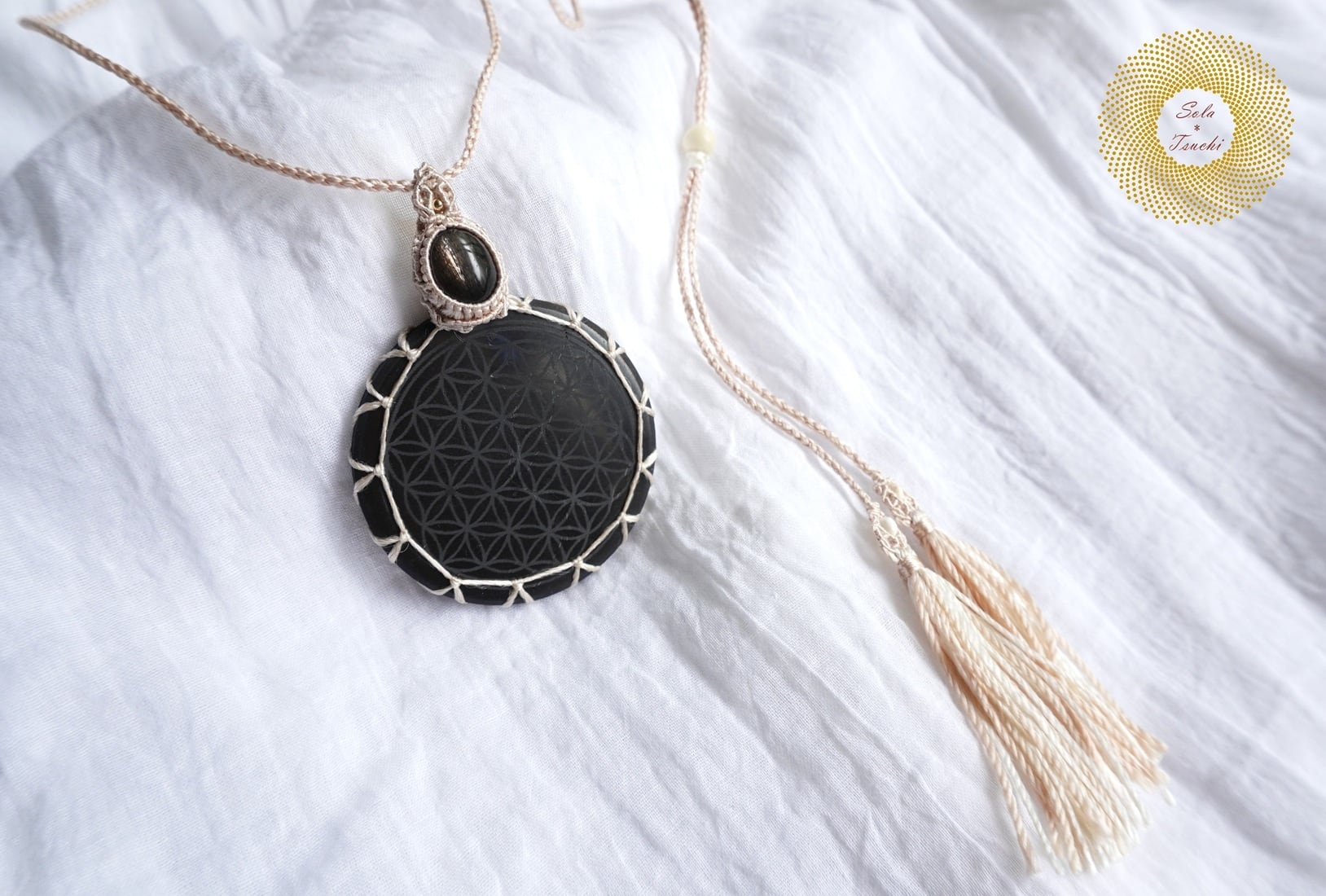 (絹糸)シュンガイトとブラックスターサンストーンのマクラメ編みペンダント 〜Through the Universe〜