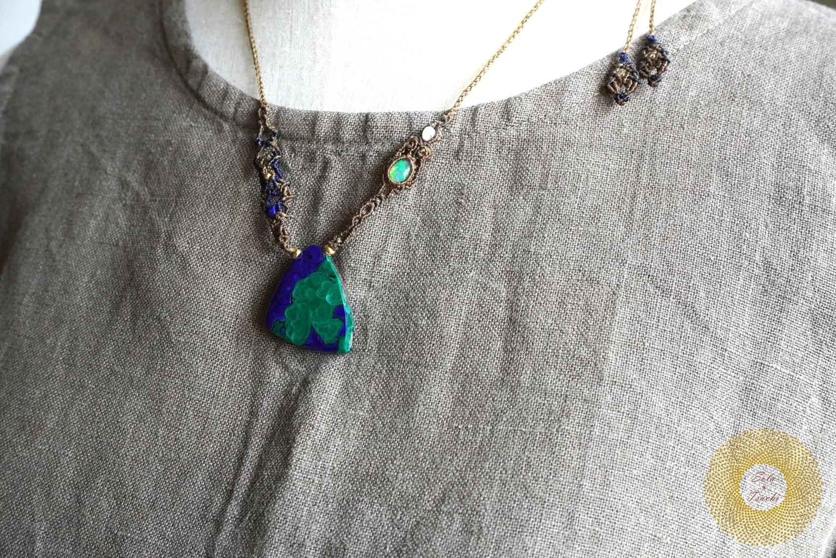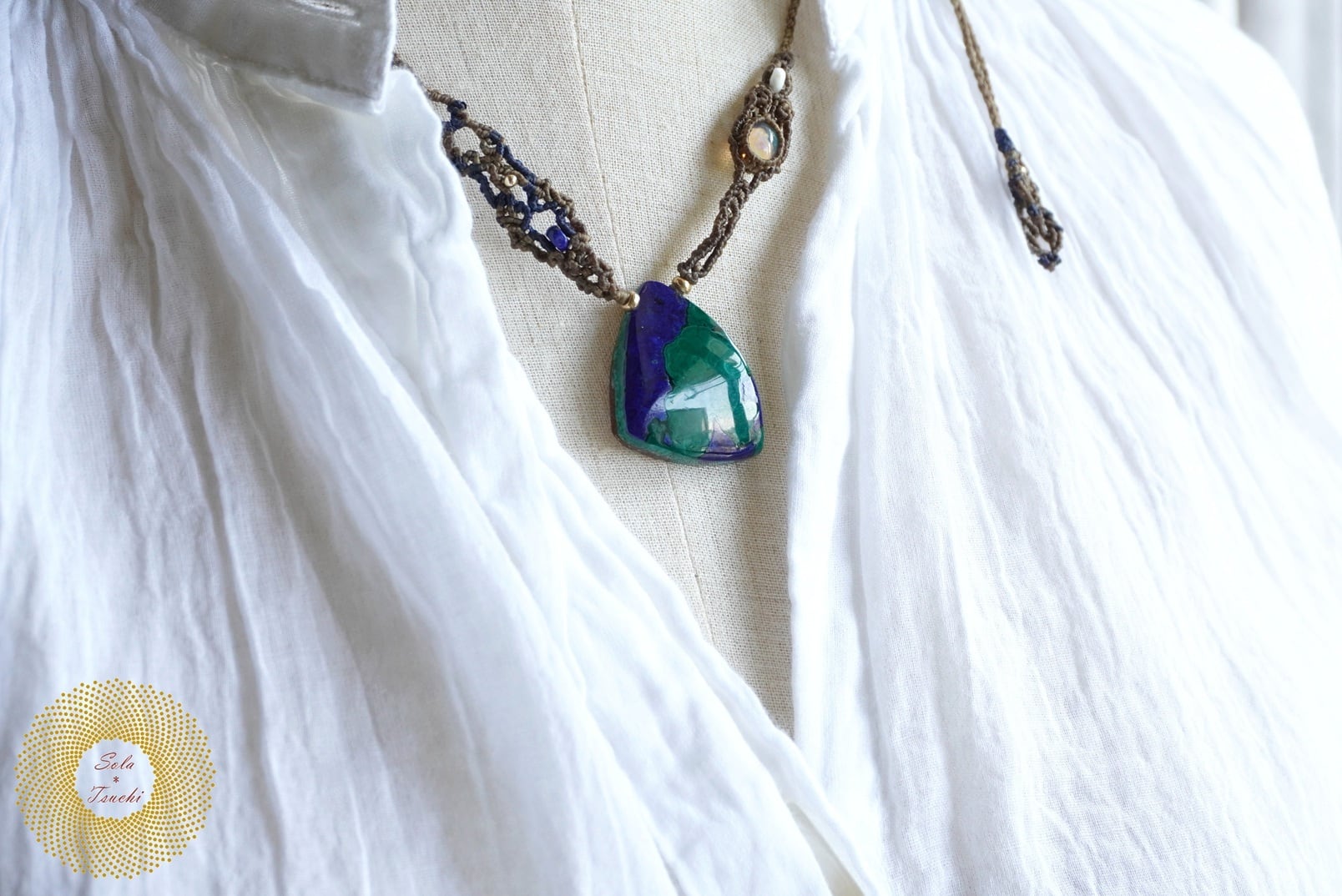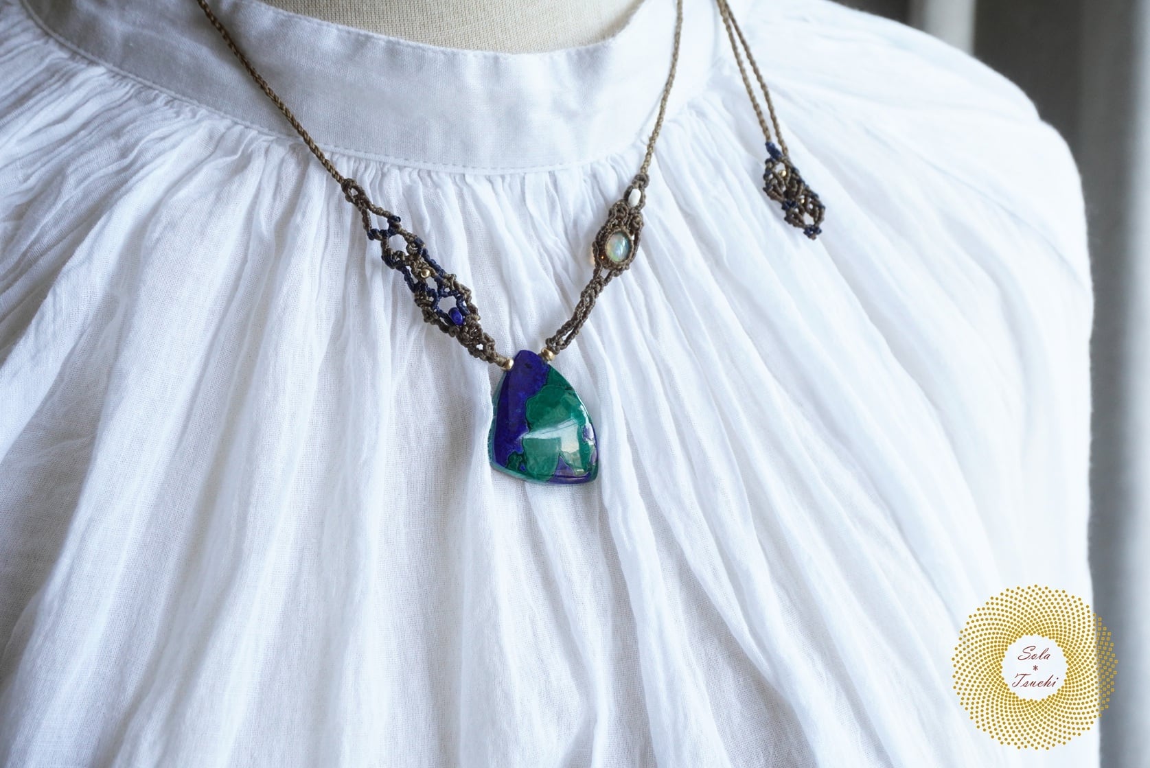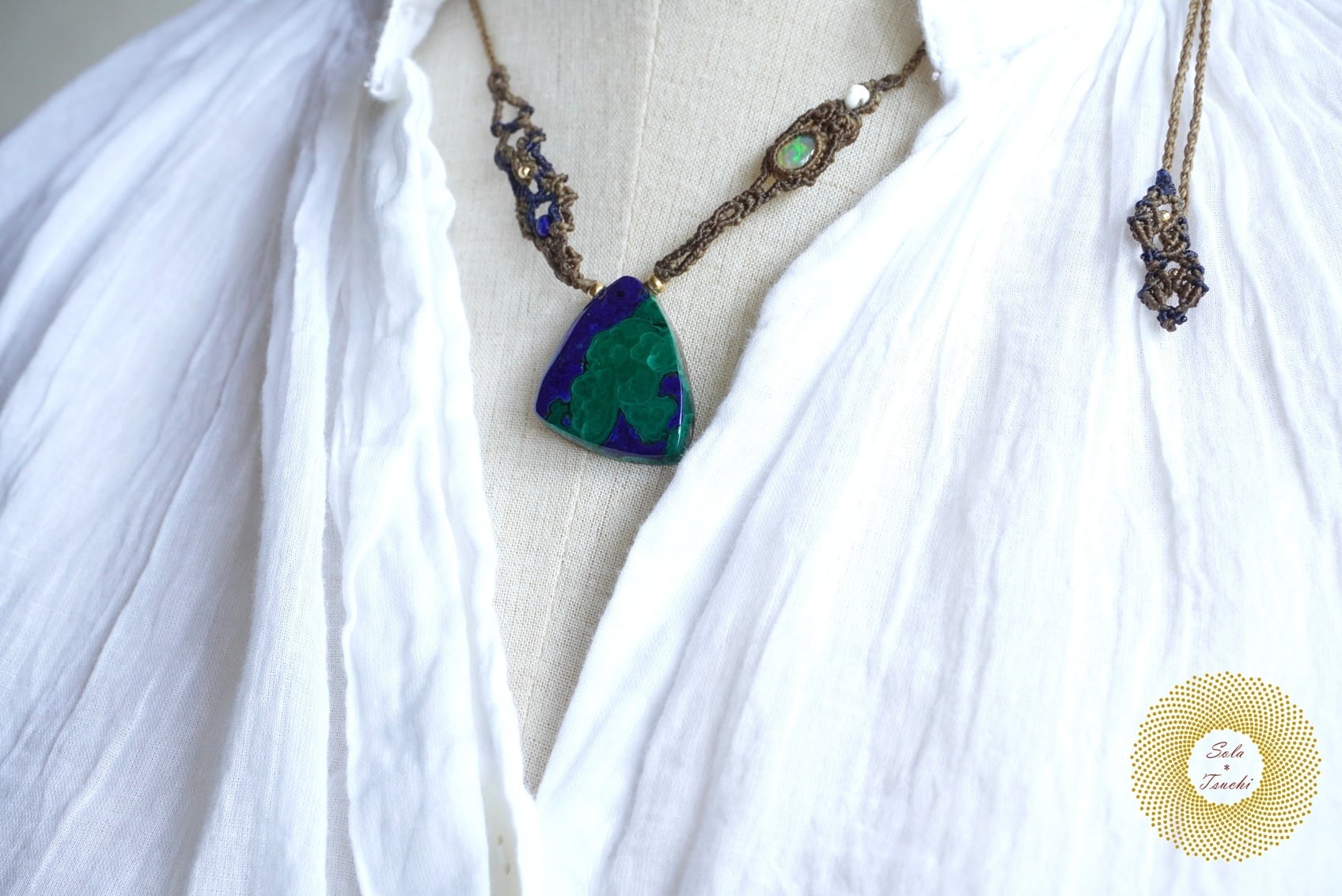 (ワックスコード)アズロマラカイトとオパールのマクラメ編みペンダント 〜Ride on〜
