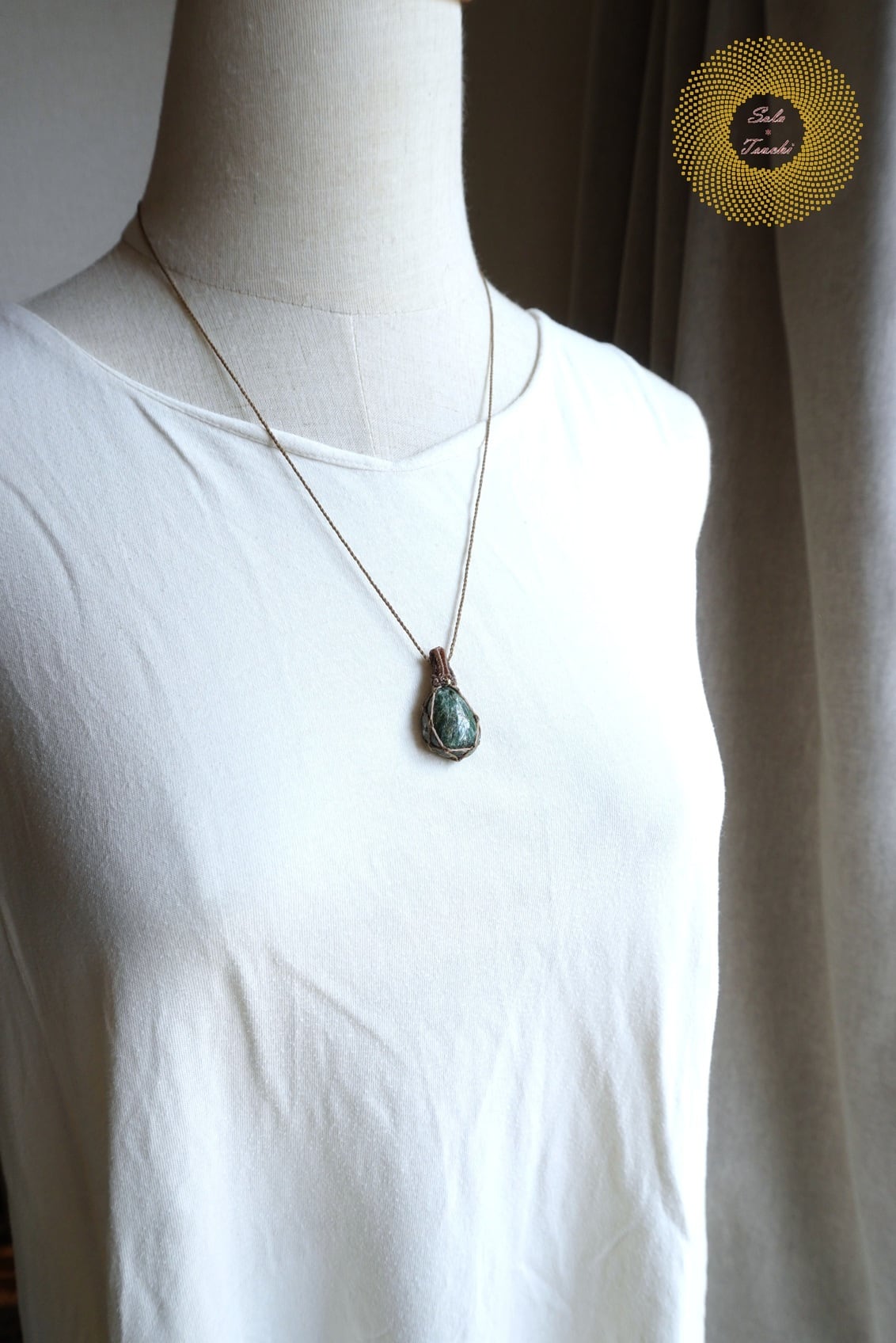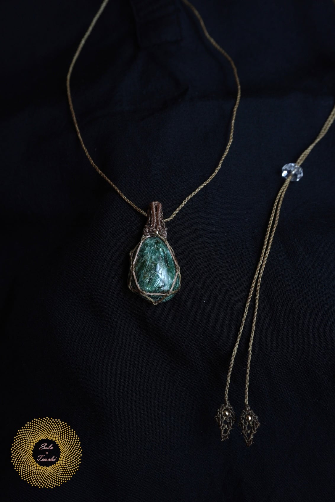 (ワックスコード)愛媛県産アクチノライトのマクラメ編みペンダント 〜秘境の泉〜