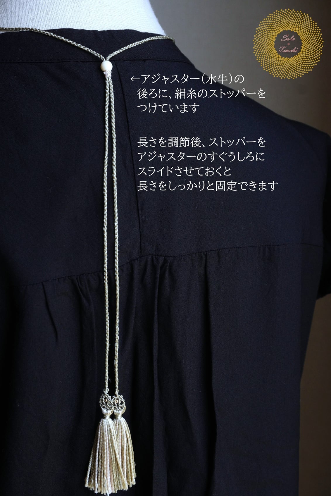 頭をくぐらせて装着し、2本をまとめている水牛(アジャスター)を
