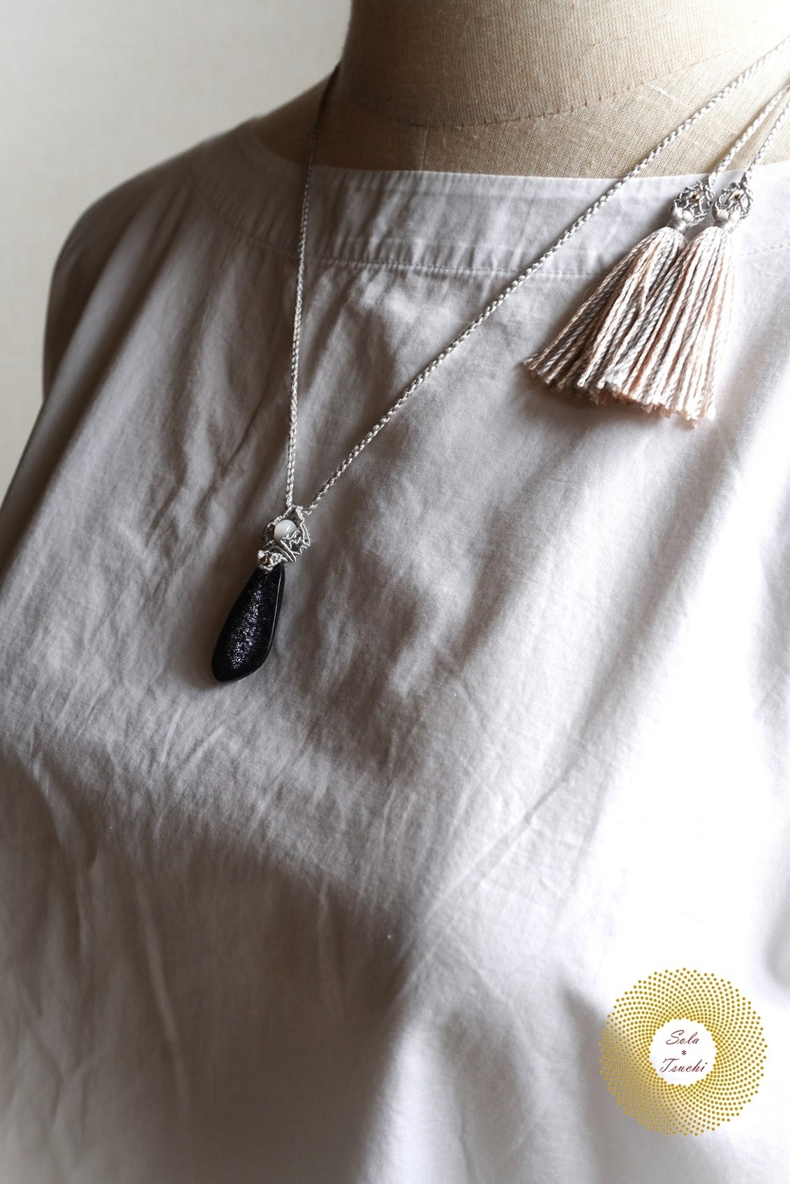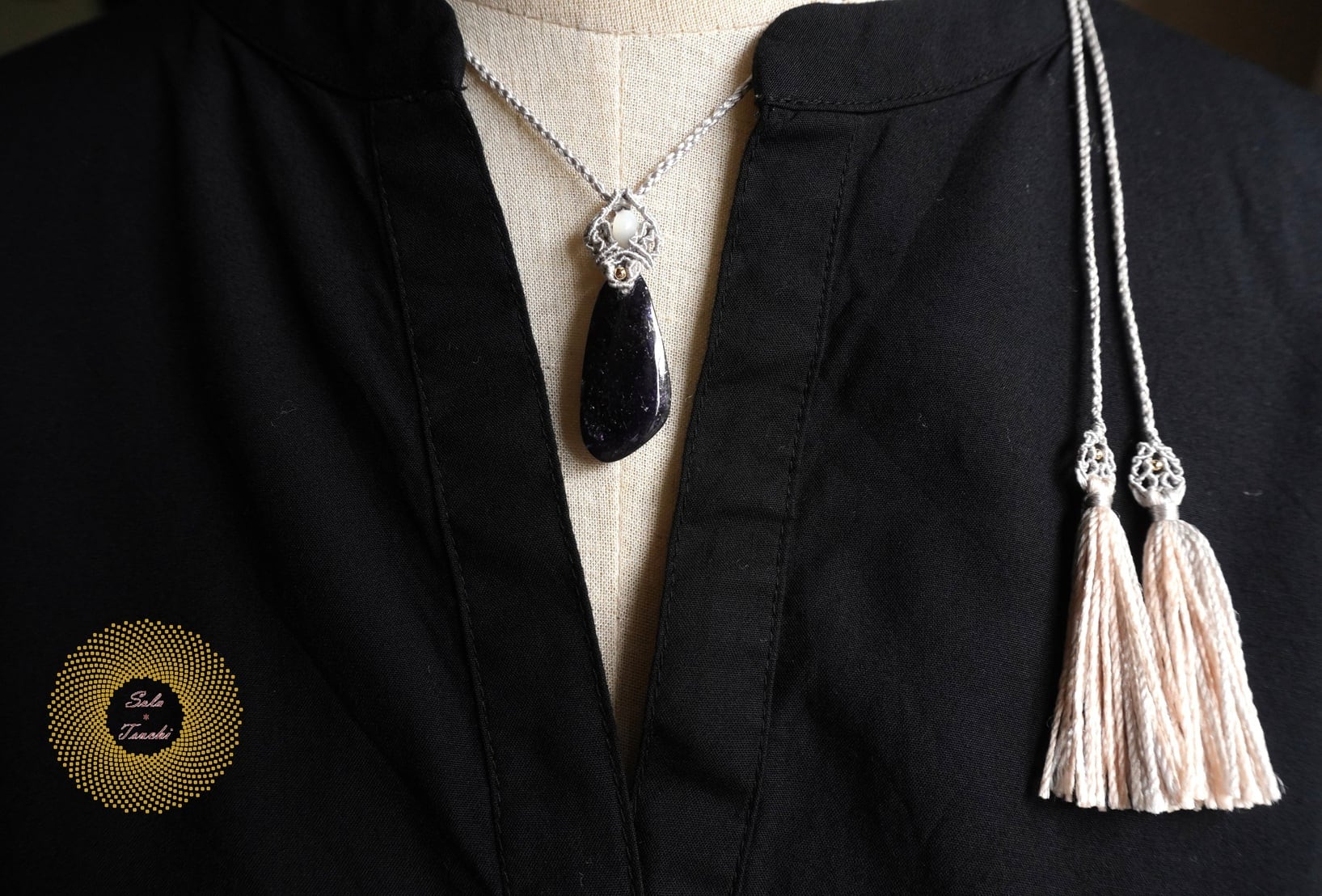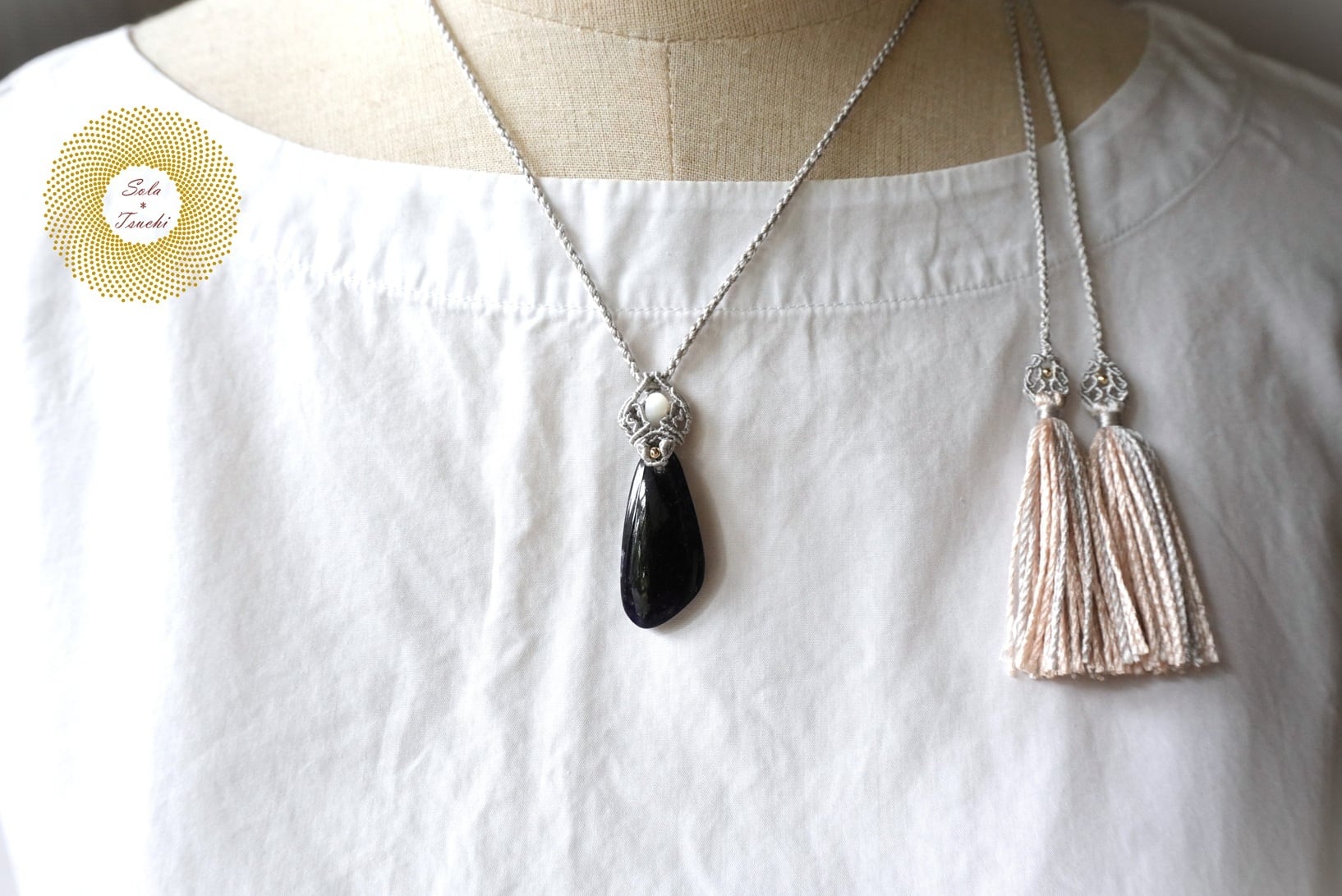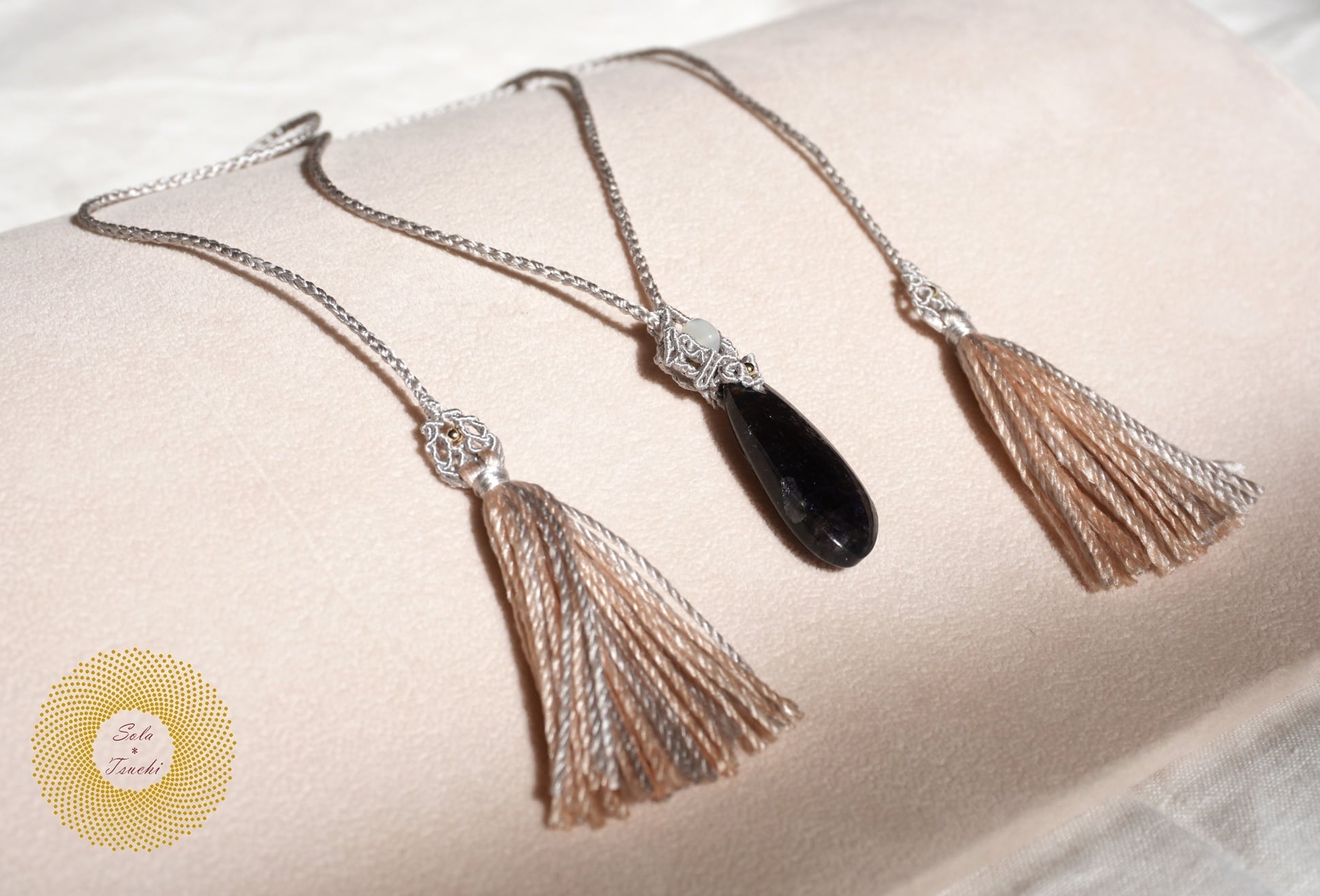 (絹糸)アイオライトサンストーンとマザーオブパールのマクラメ編みペンダント 〜Reflector〜