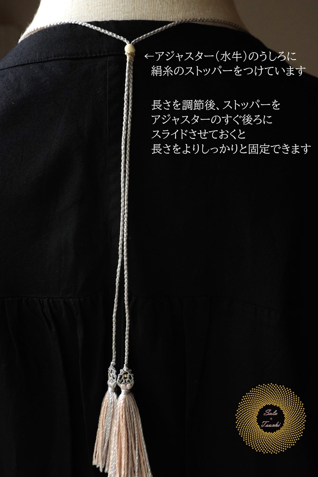 アジャスターの後ろに絹糸のストッパーを