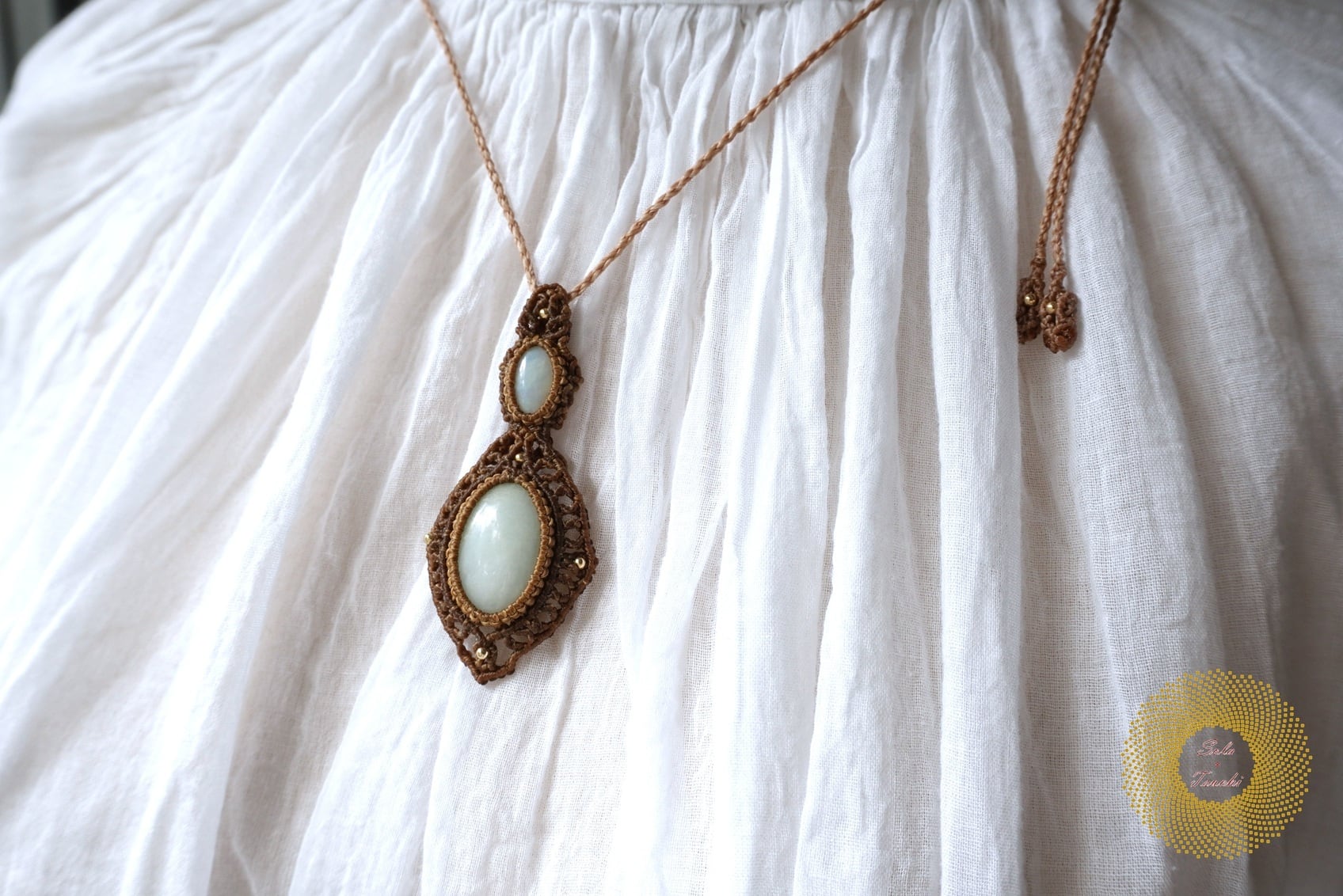 (ワックスコード)白翡翠とホワイトオパールのマクラメ編みペンダント 〜Flowers〜