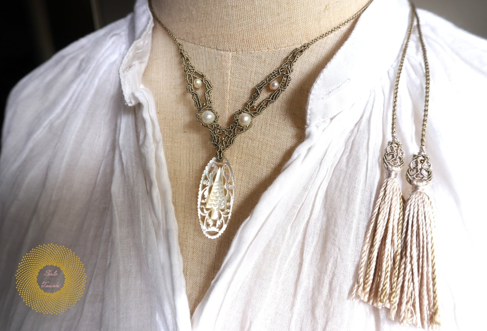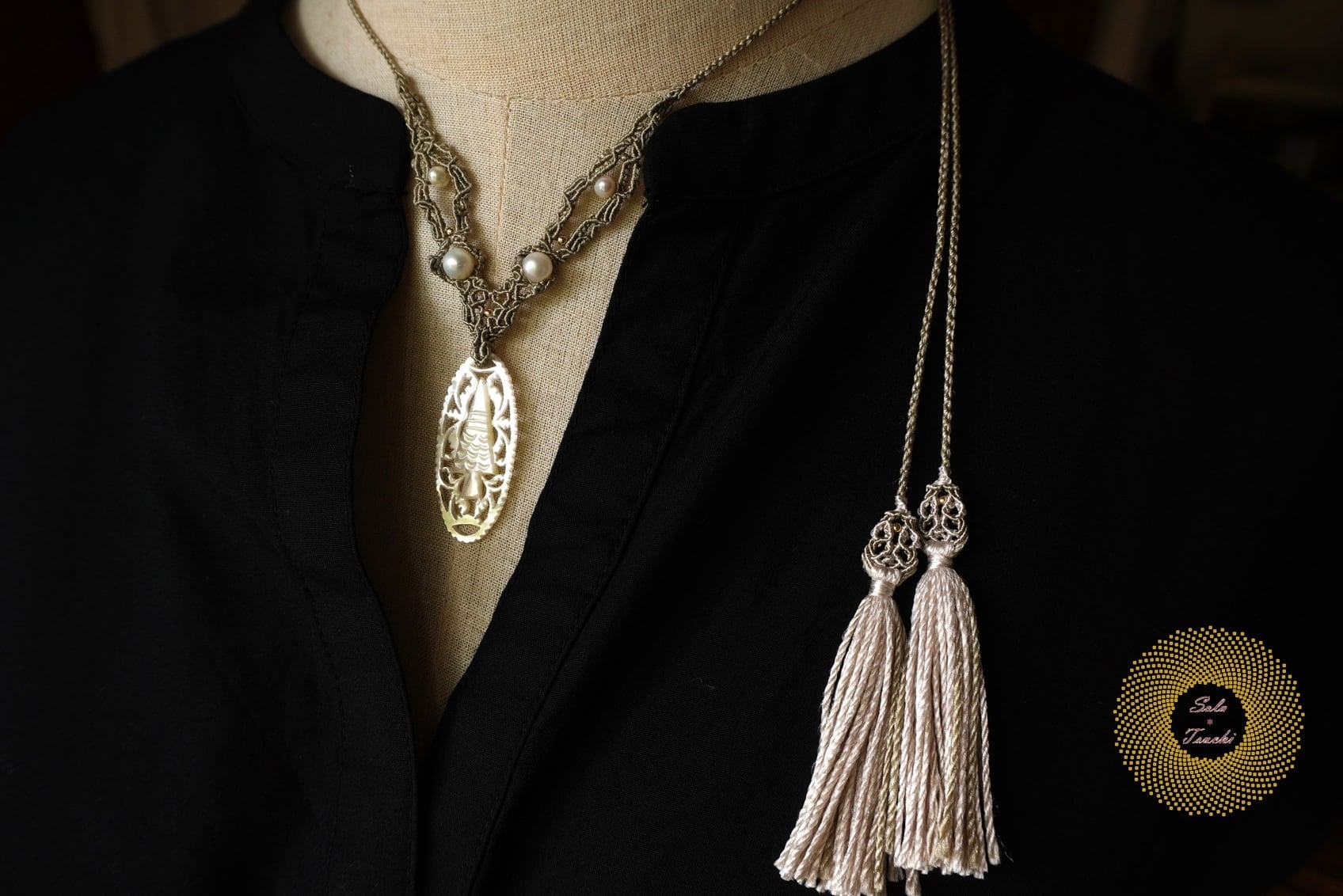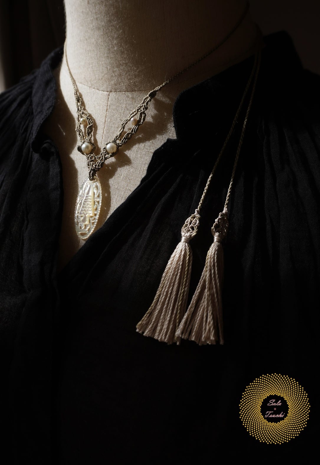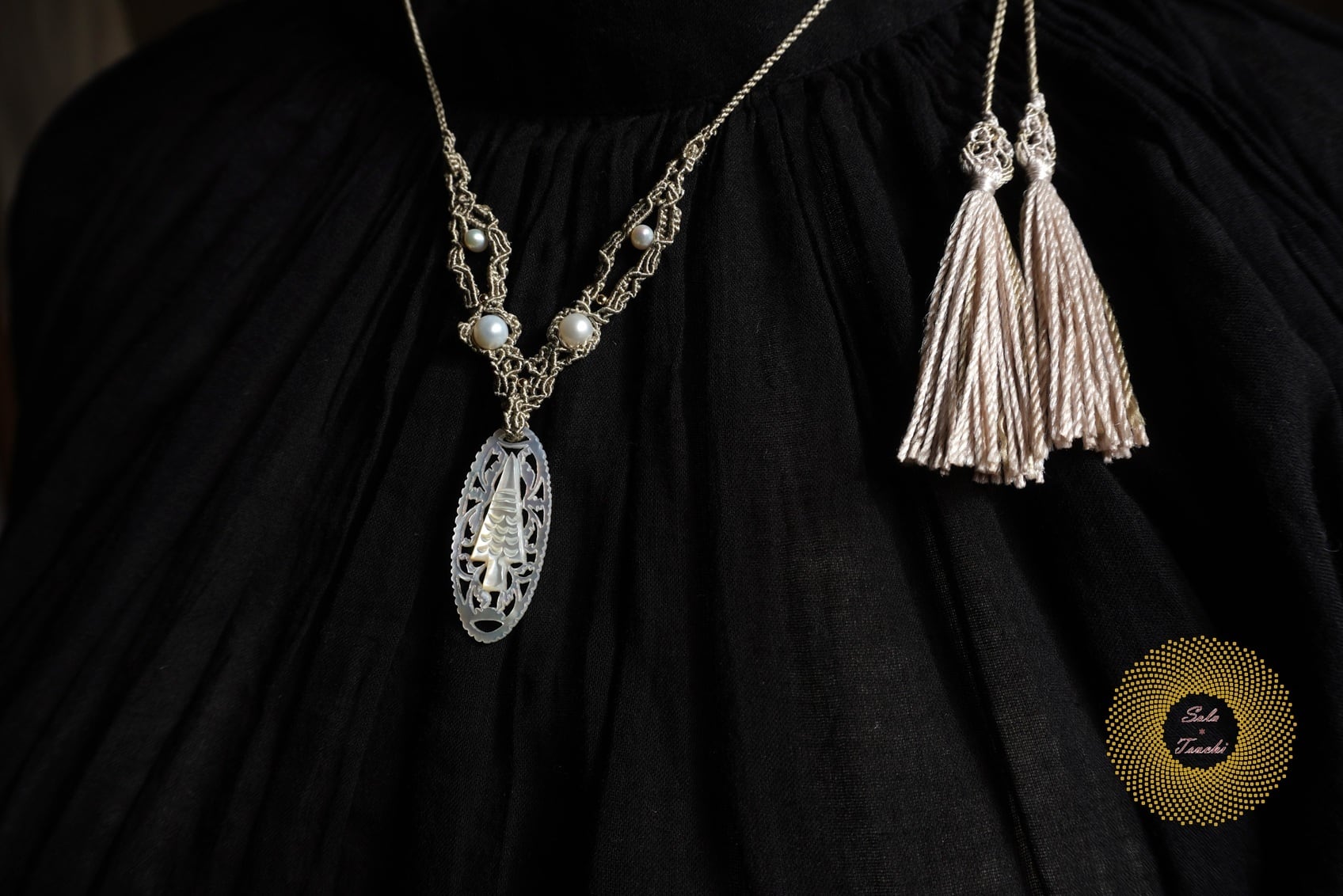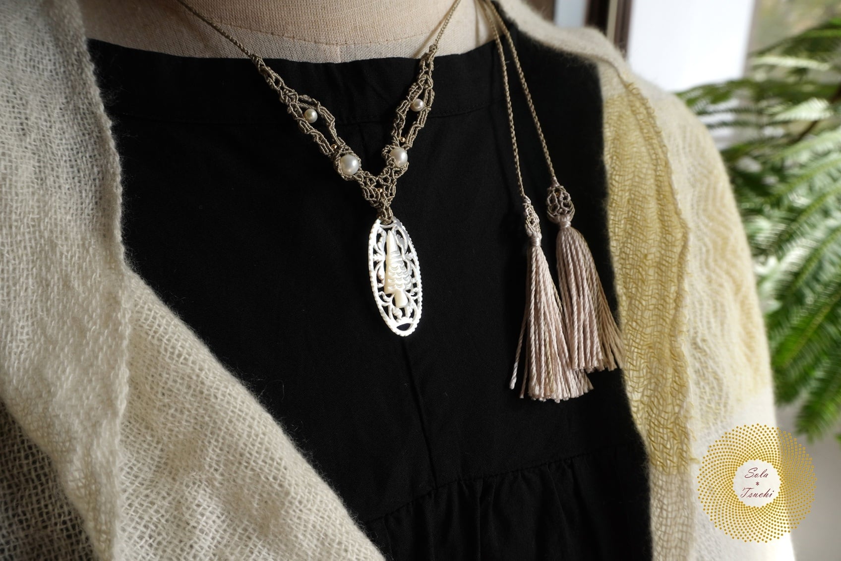 (絹糸)ベツレヘムパールと淡水パールのマクラメ編みネックレス 〜Line of Cypress〜