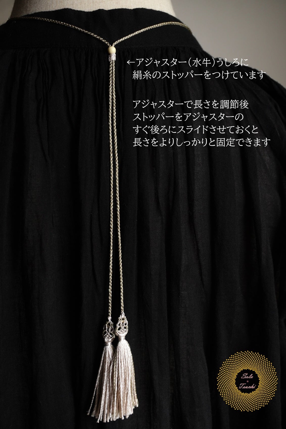 頭をくぐらせて装着し、2本をまとめている水牛(アジャスター)