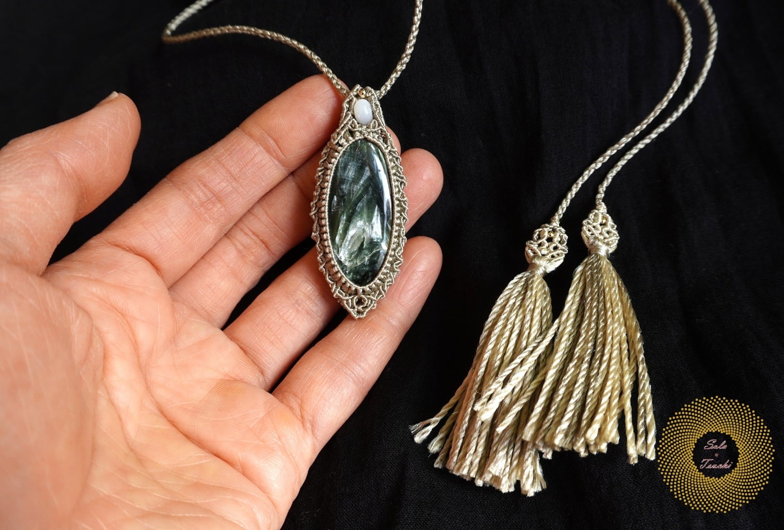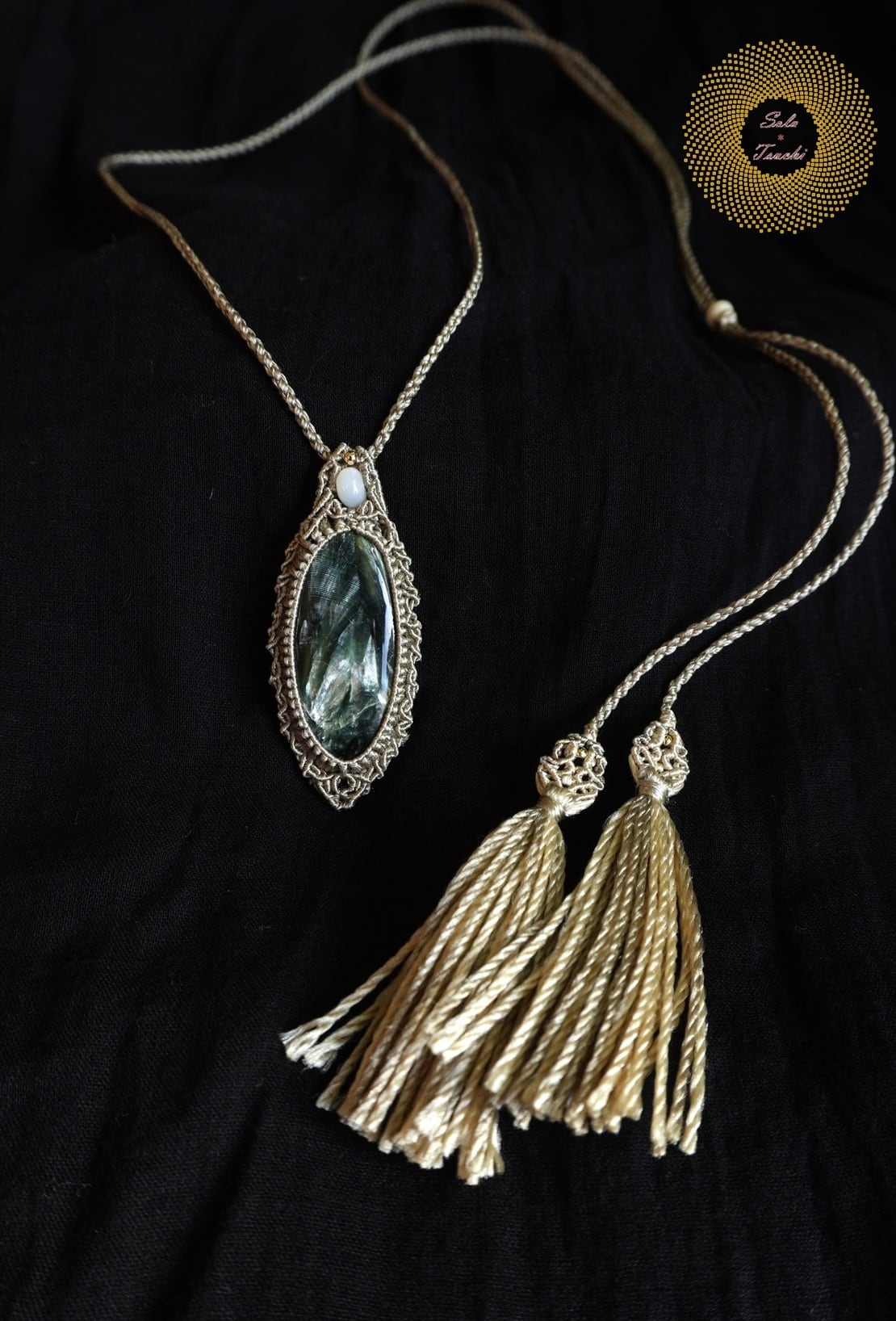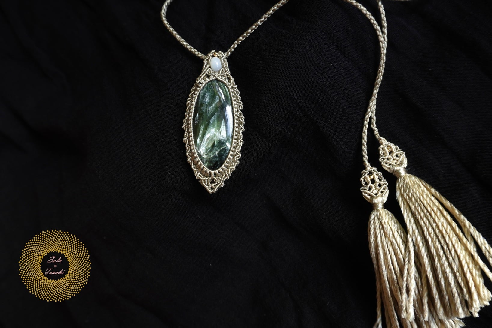 (絹糸)セラフィナイトのマクラメ編みペンダント 〜Light path〜