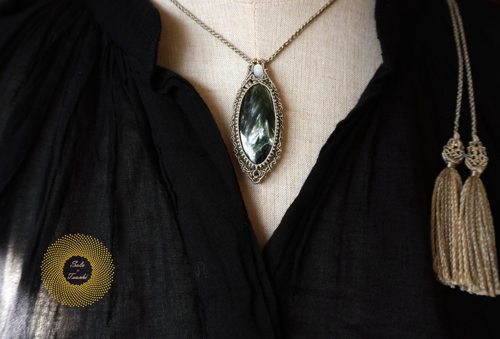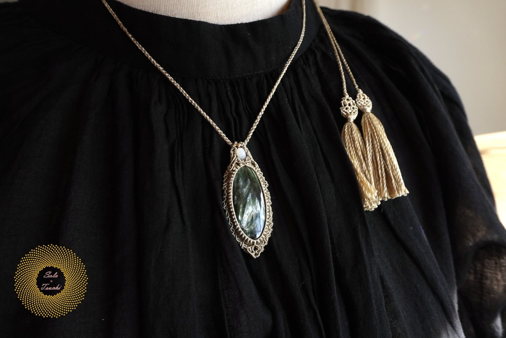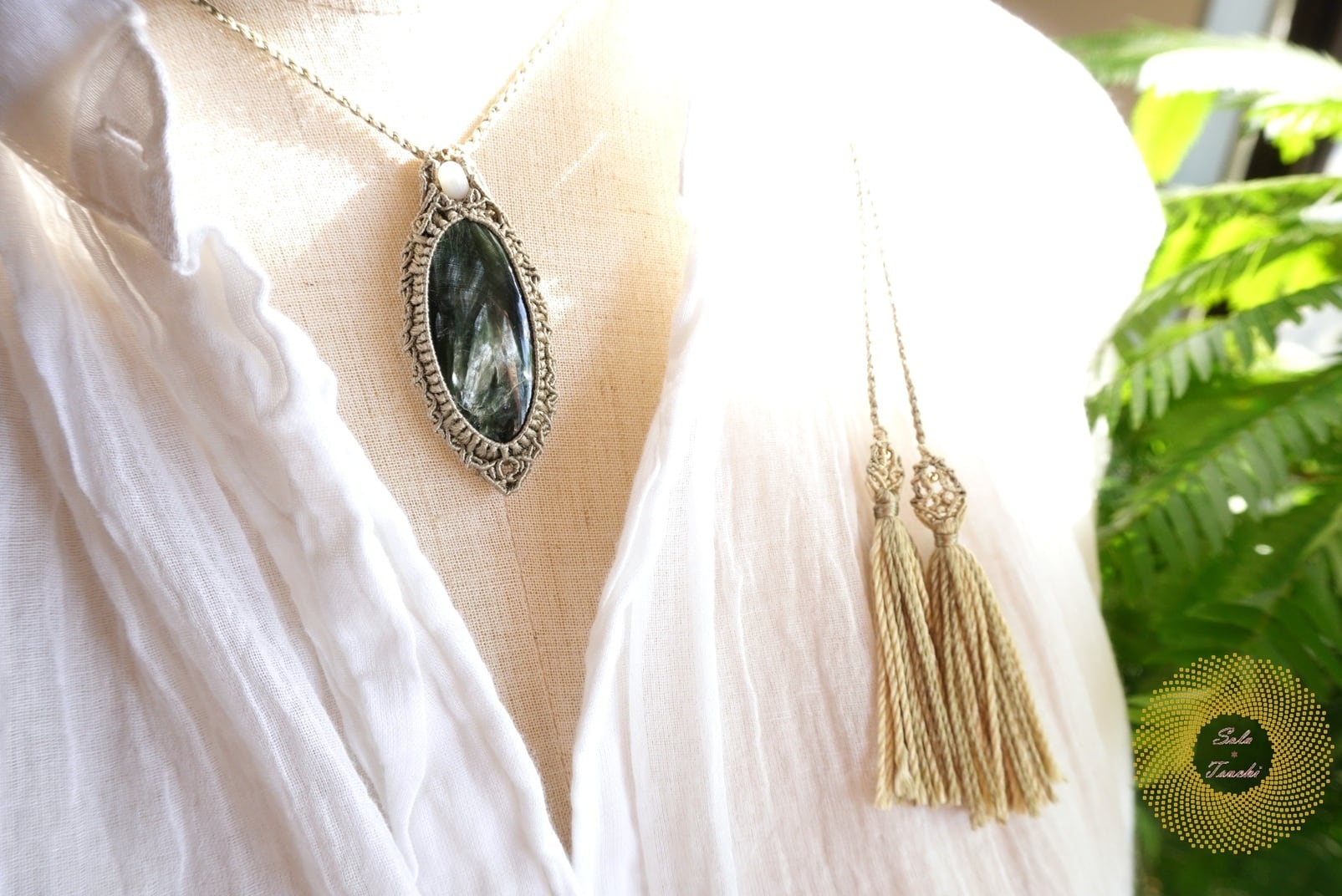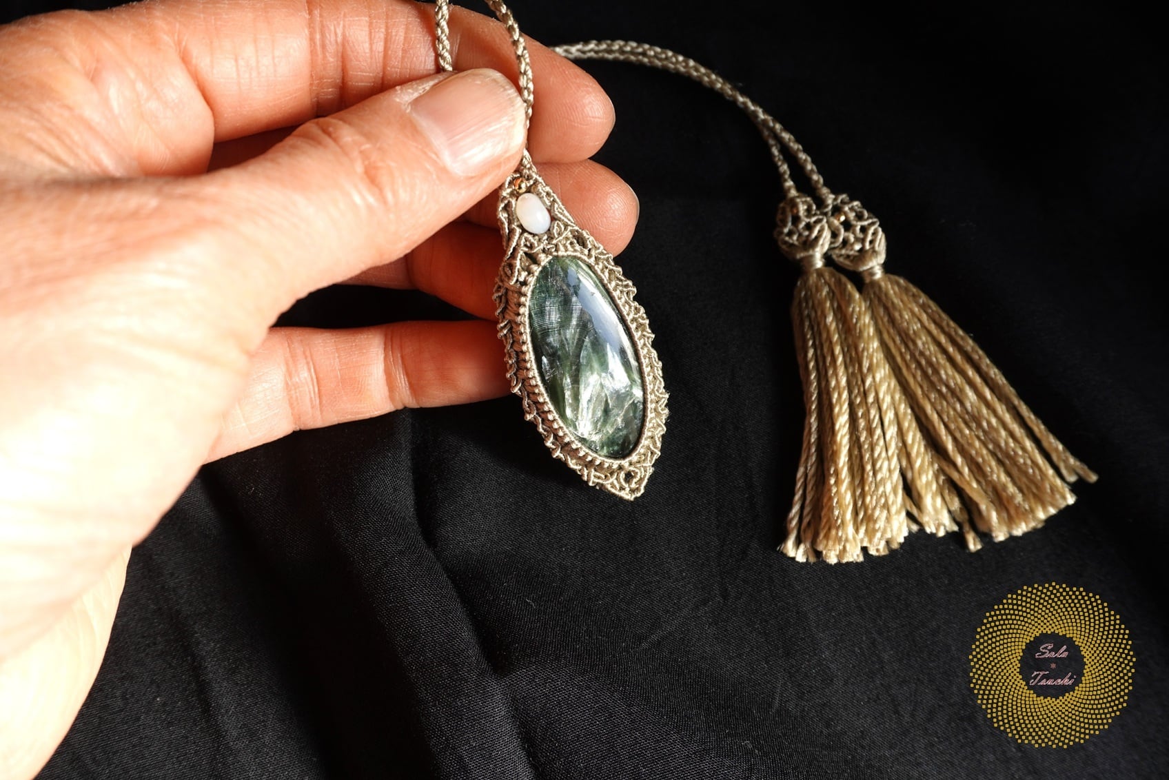 (絹糸)セラフィナイトのマクラメ編みペンダント 〜Light path〜