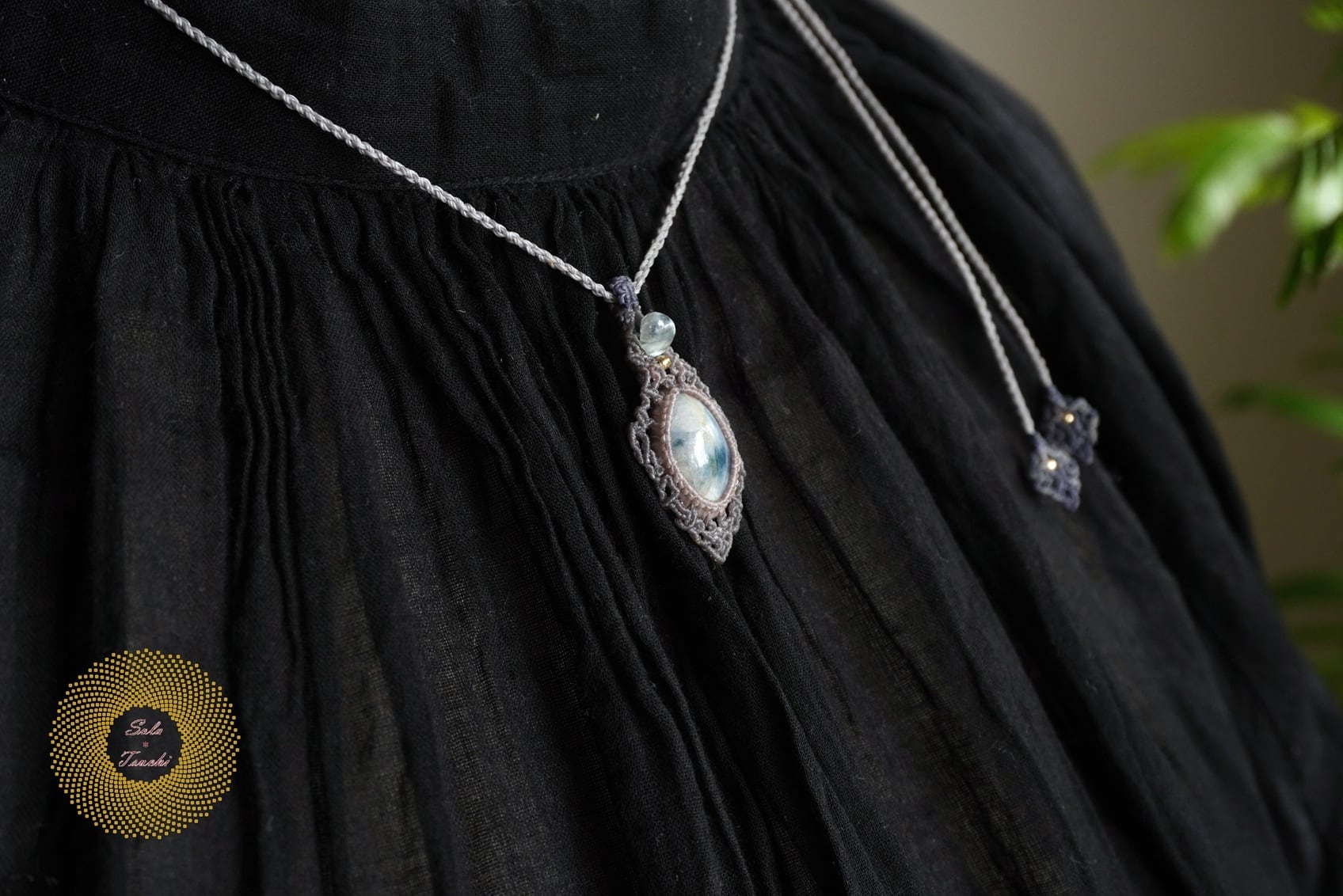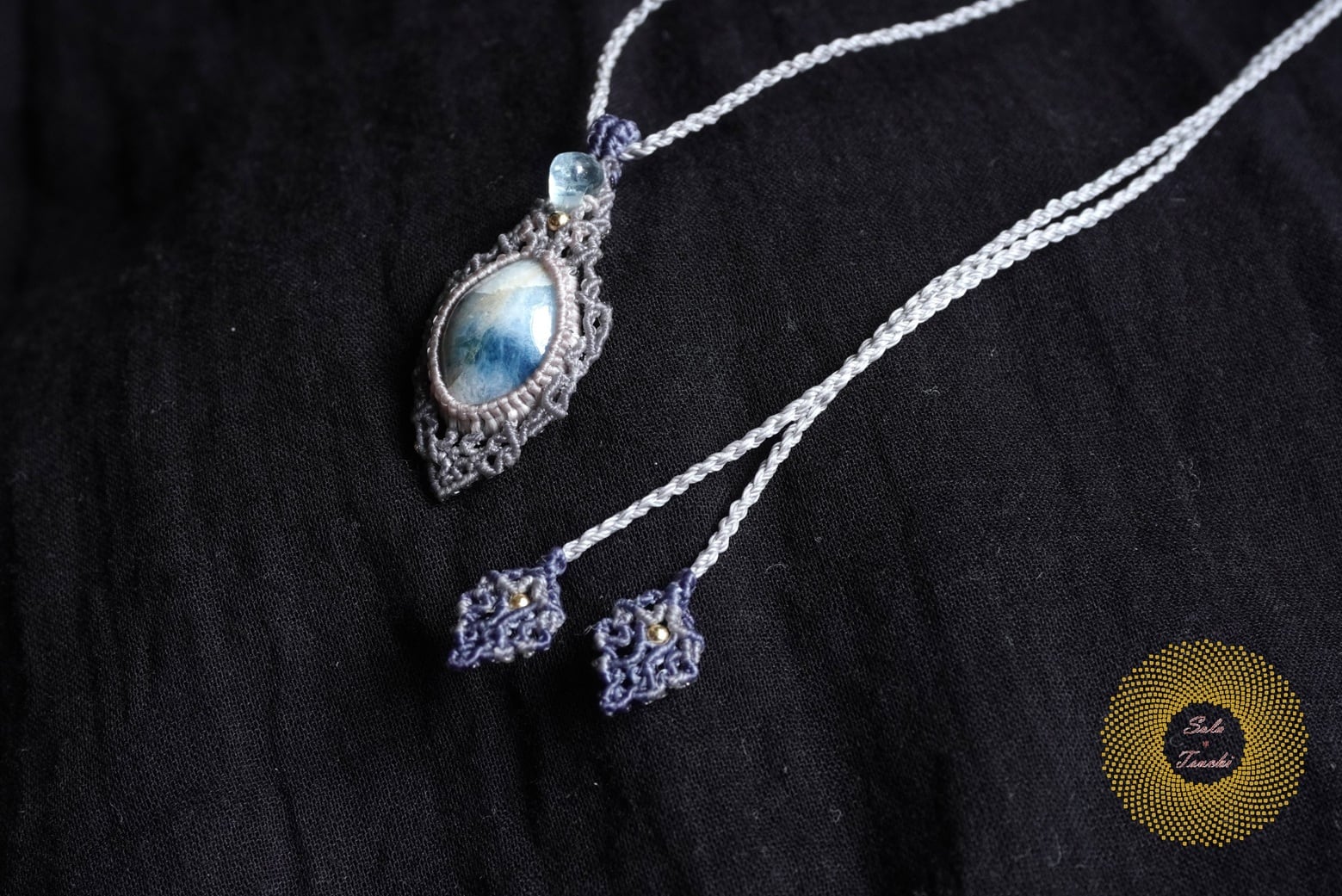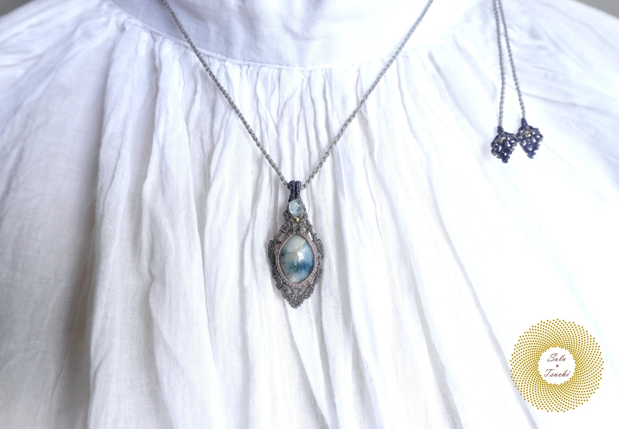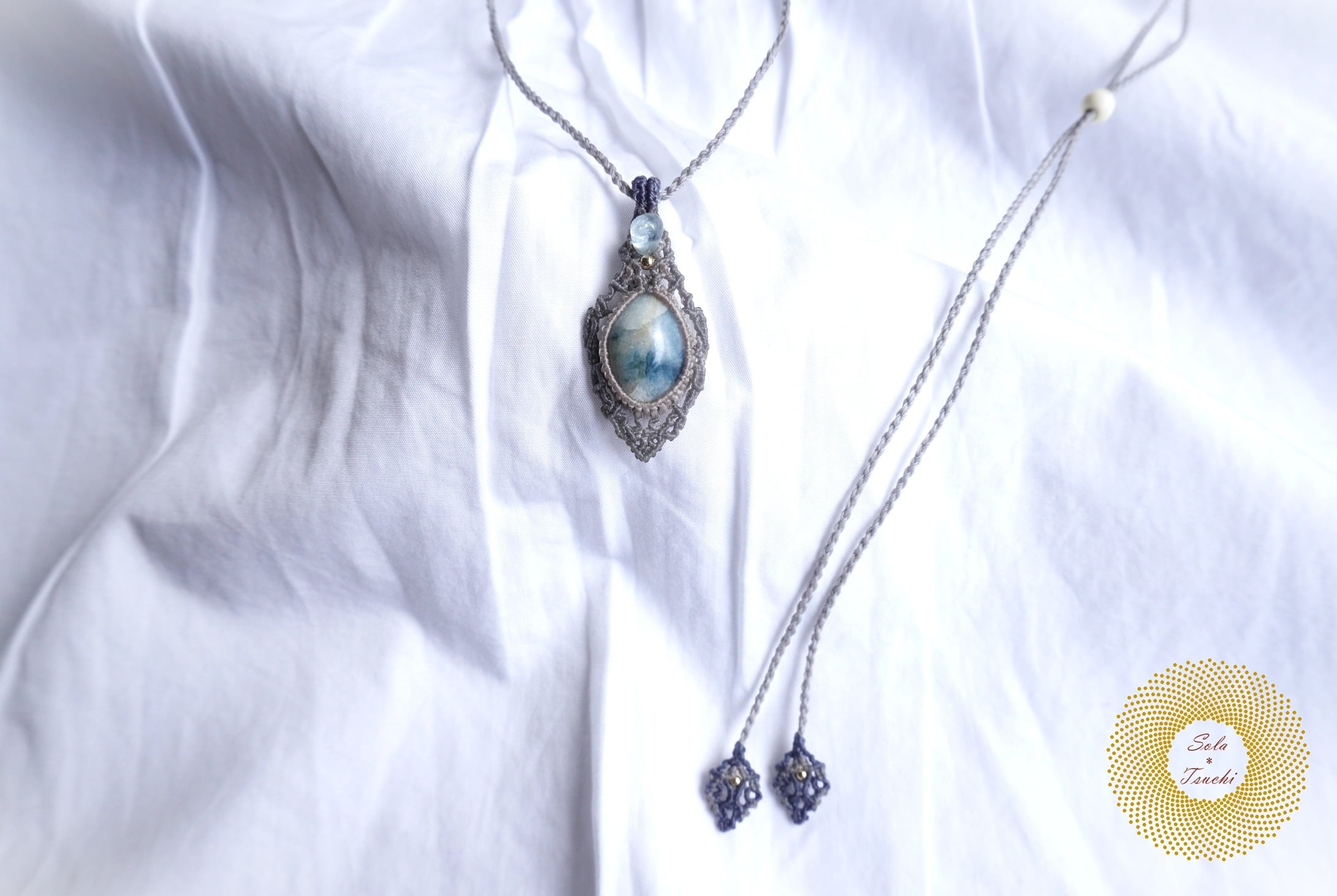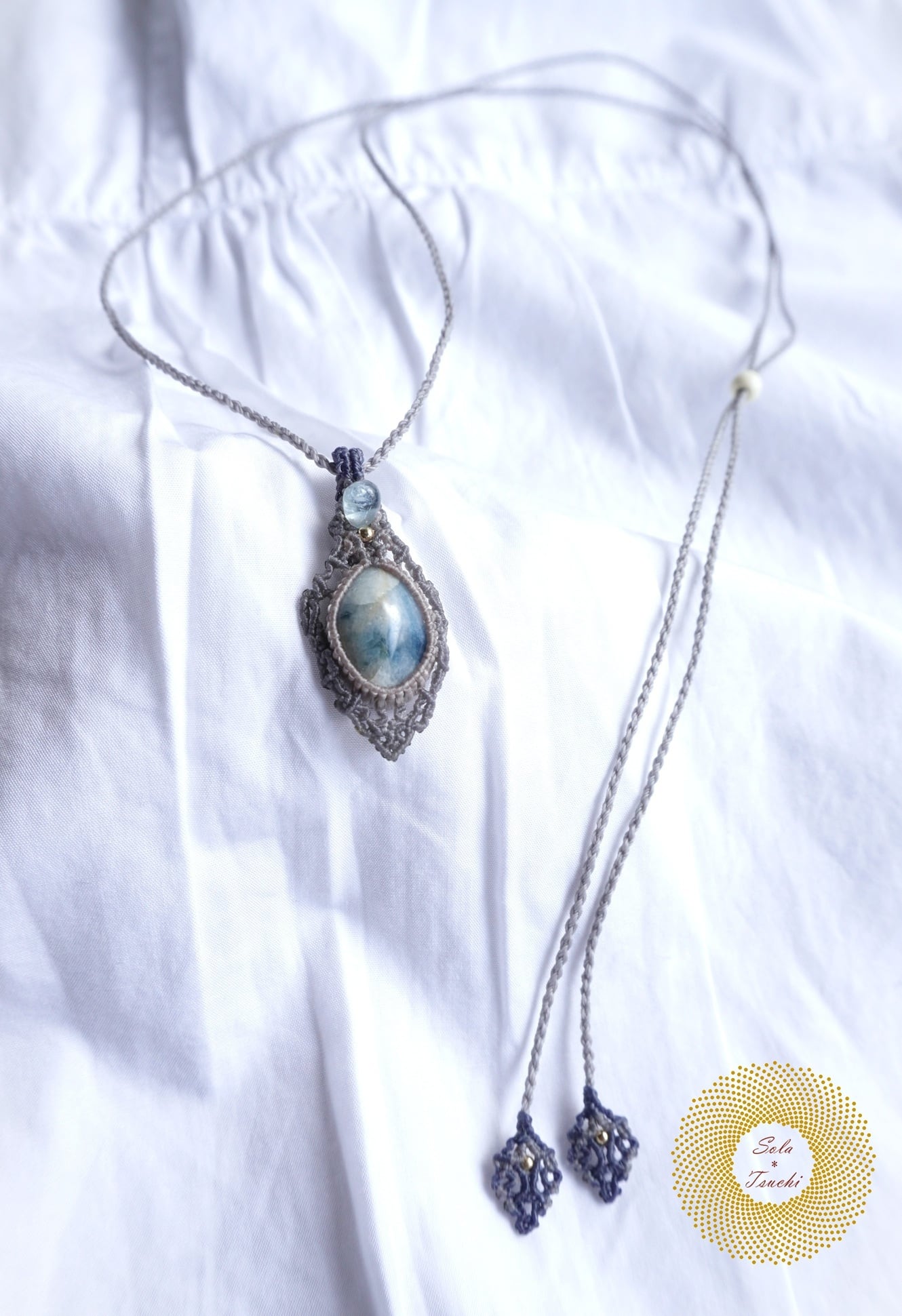 (ワックスコード)入りコン沢産 青翡翠とアクアマリンのマクラメ編みペンダント 〜水の流れるが如く〜