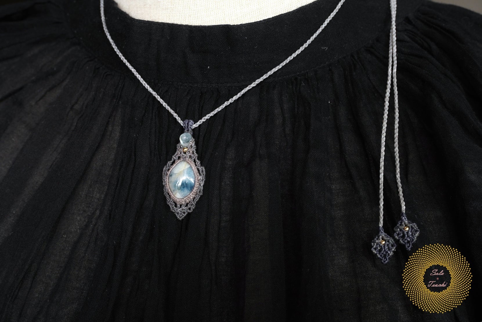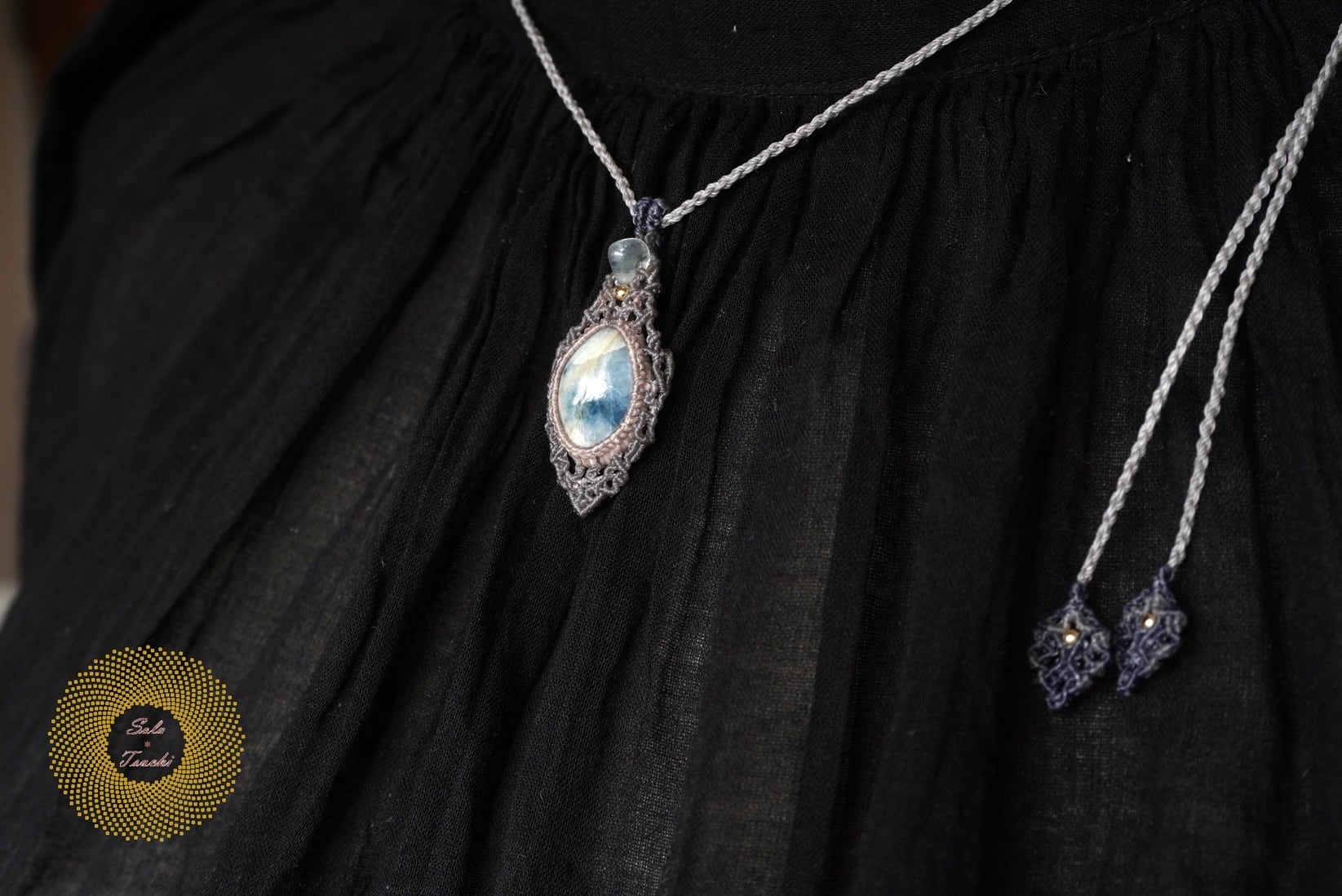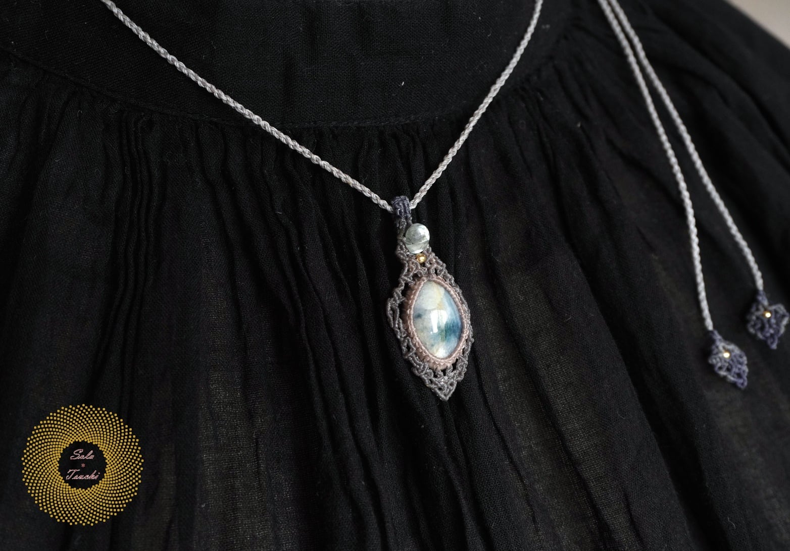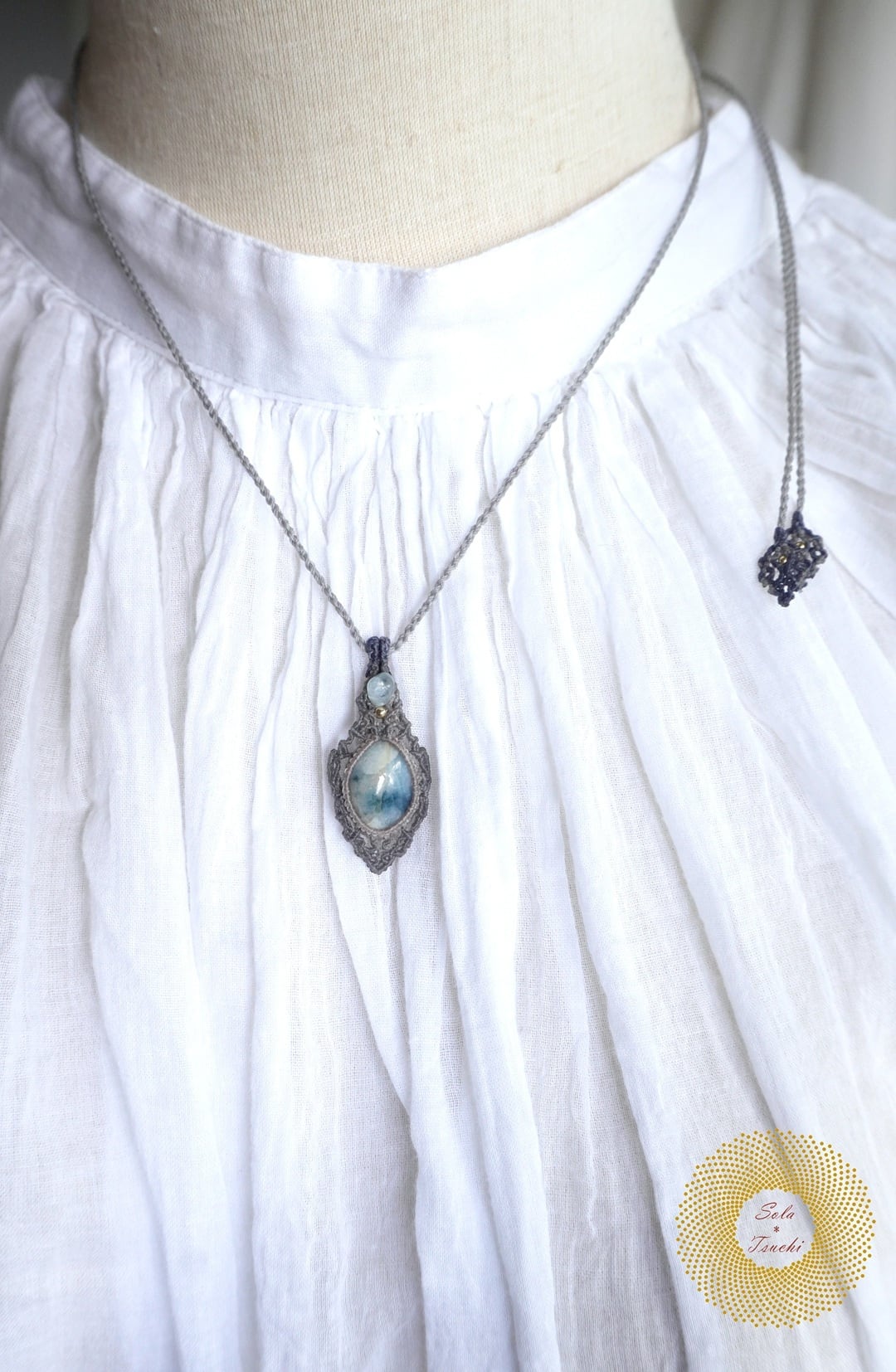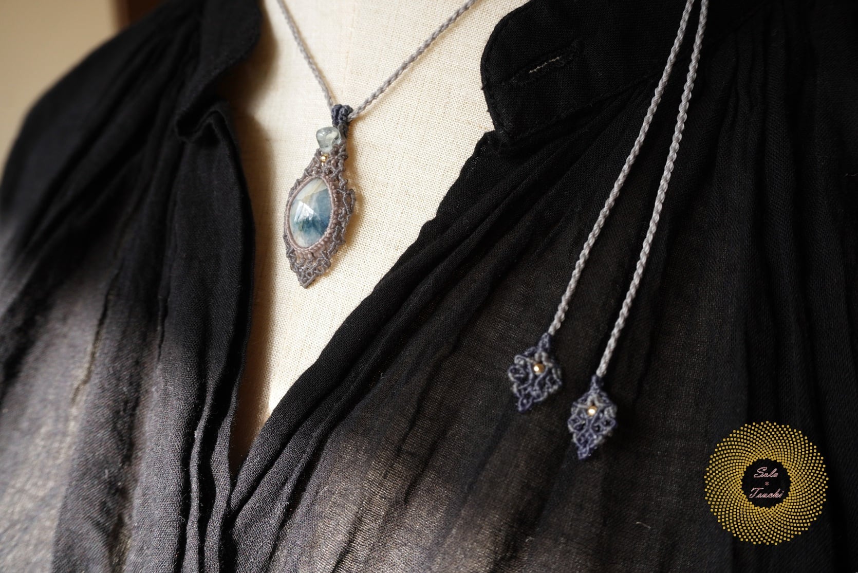 (ワックスコード)入りコン沢産 青翡翠とアクアマリンのマクラメ編みペンダント 〜水の流れるが如く〜