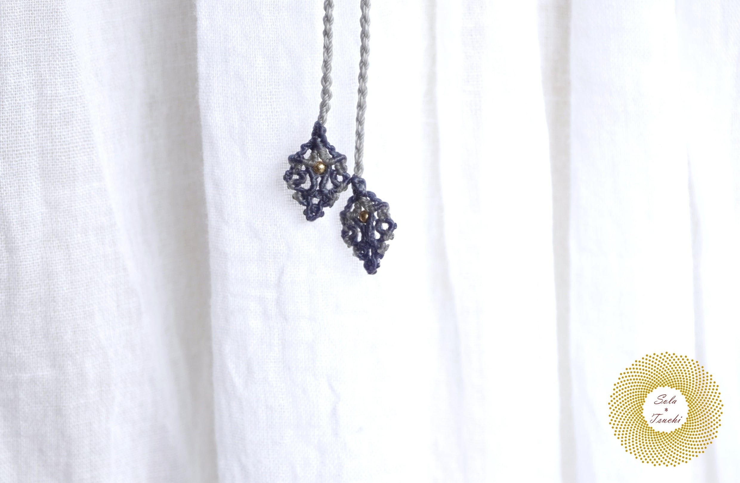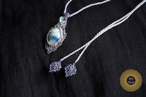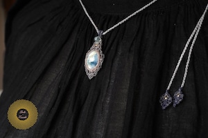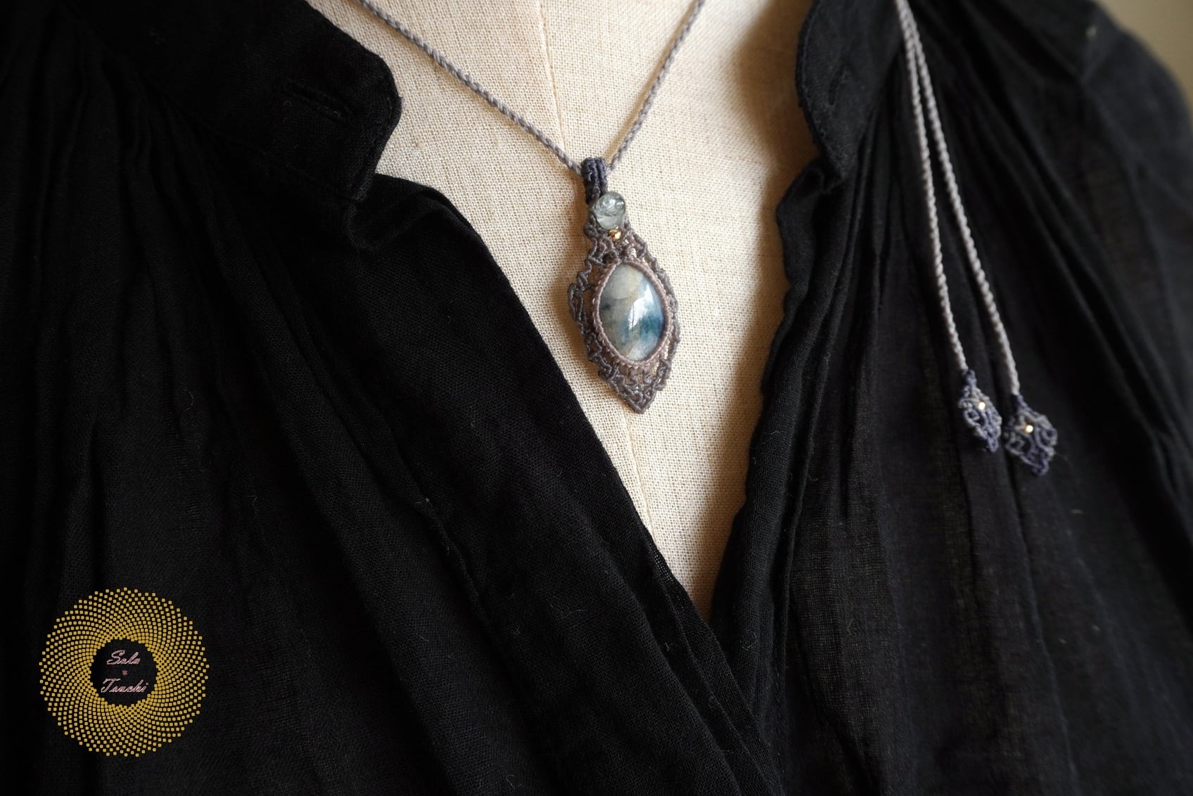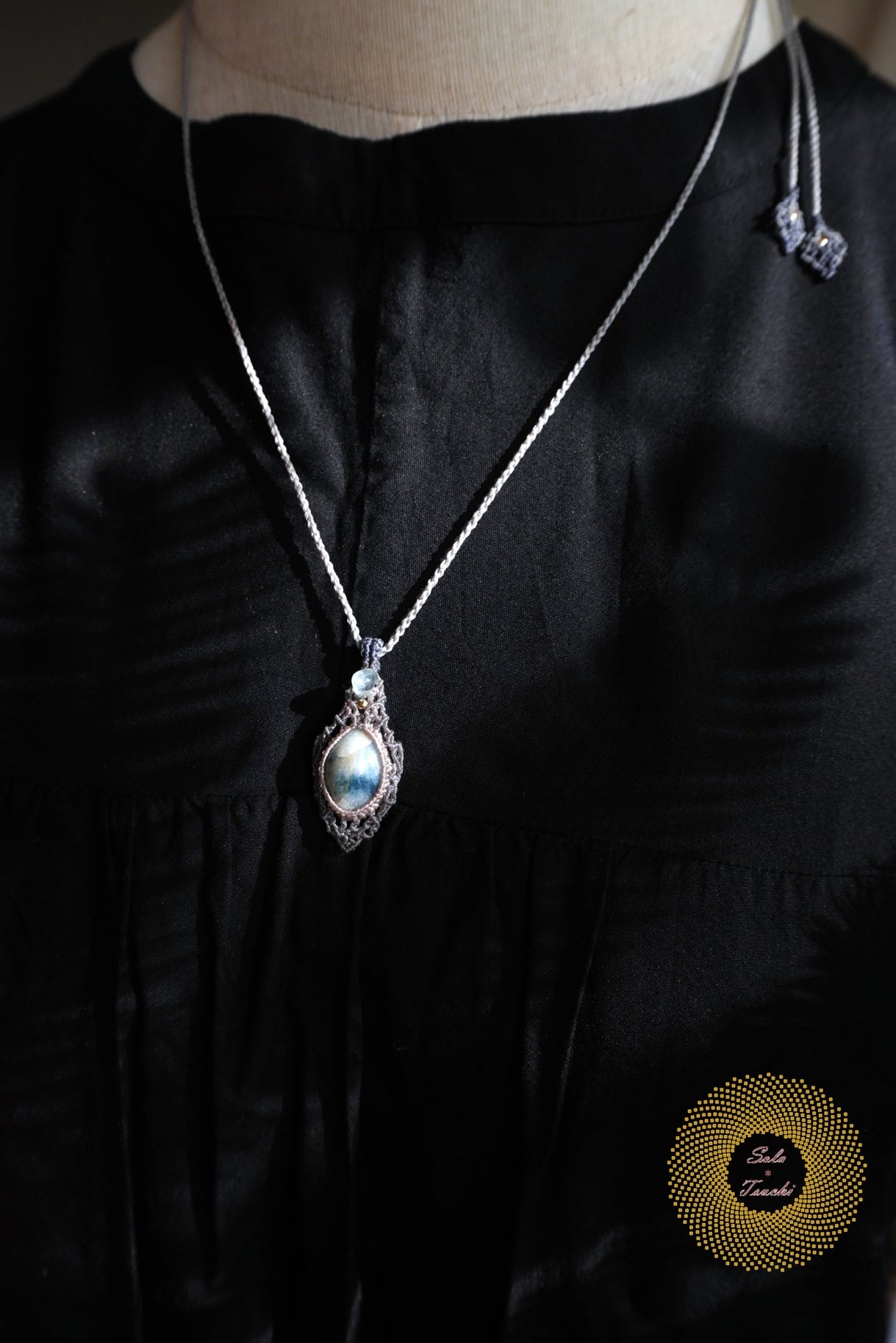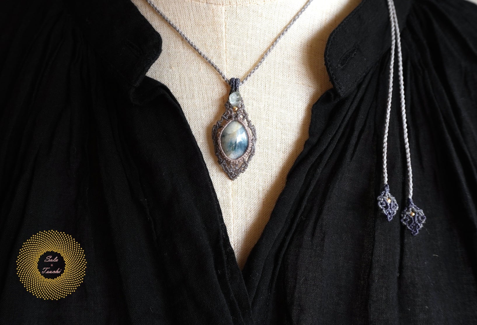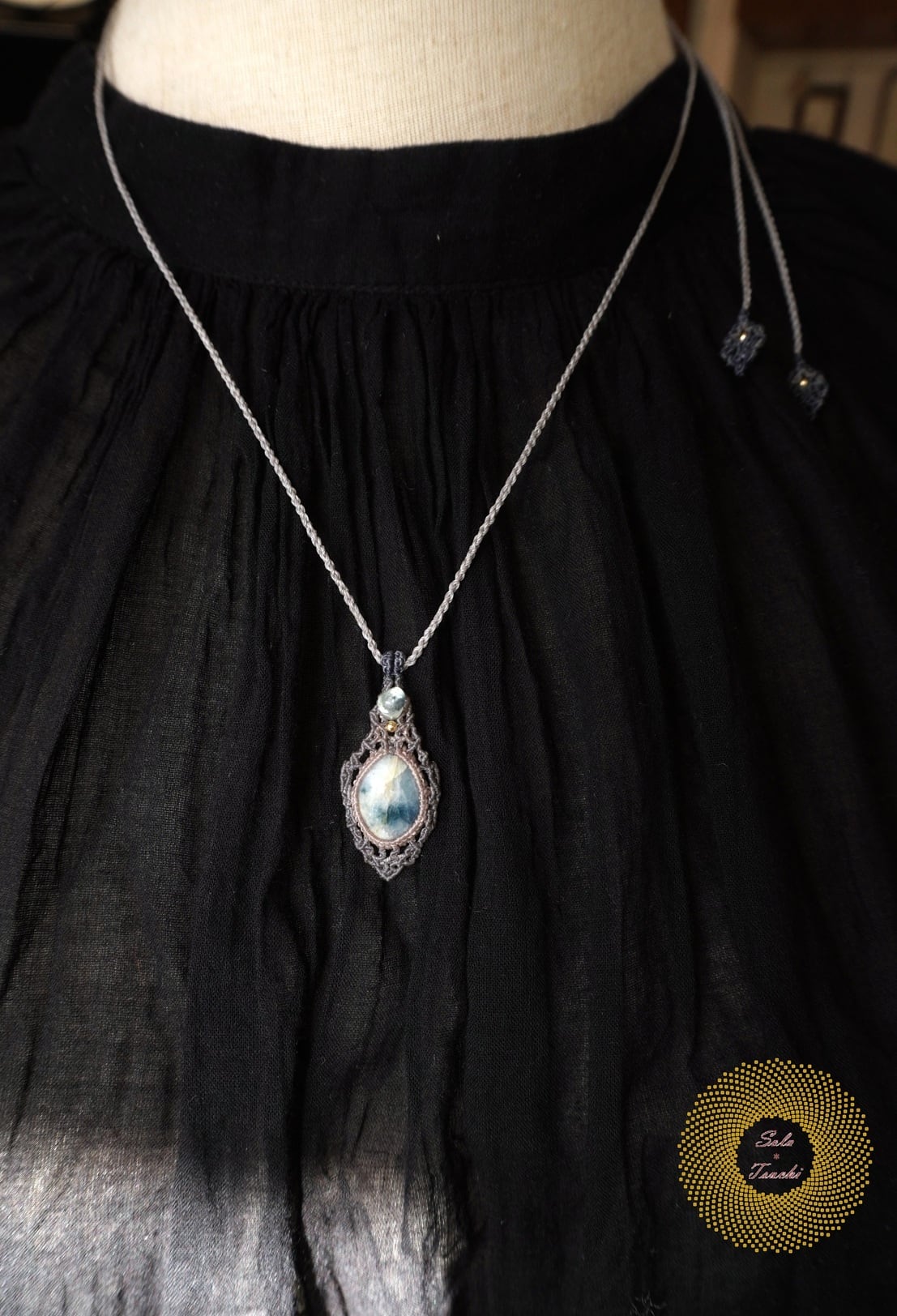 (ワックスコード)入りコン沢産 青翡翠とアクアマリンのマクラメ編みペンダント 〜水の流れるが如く〜