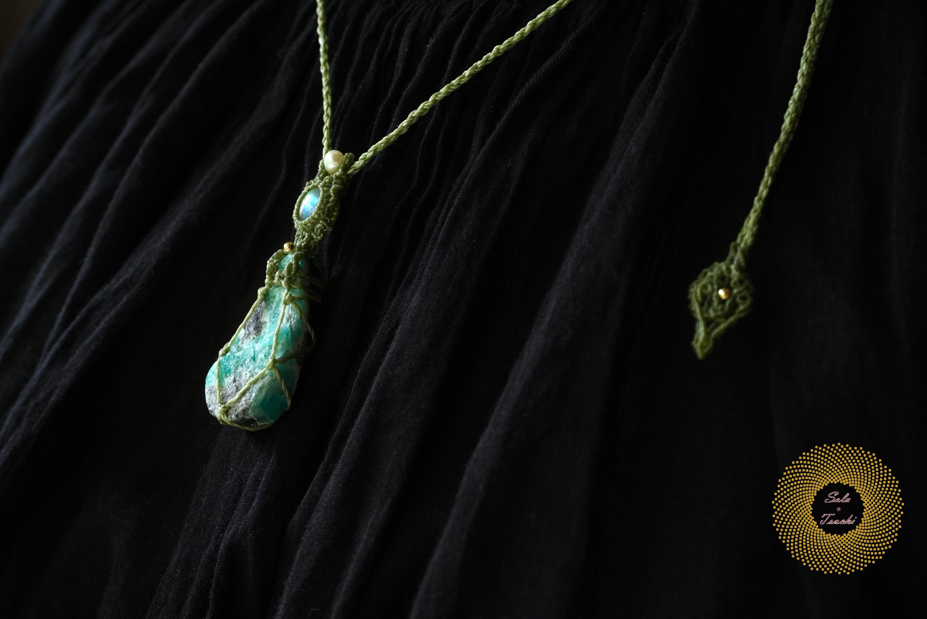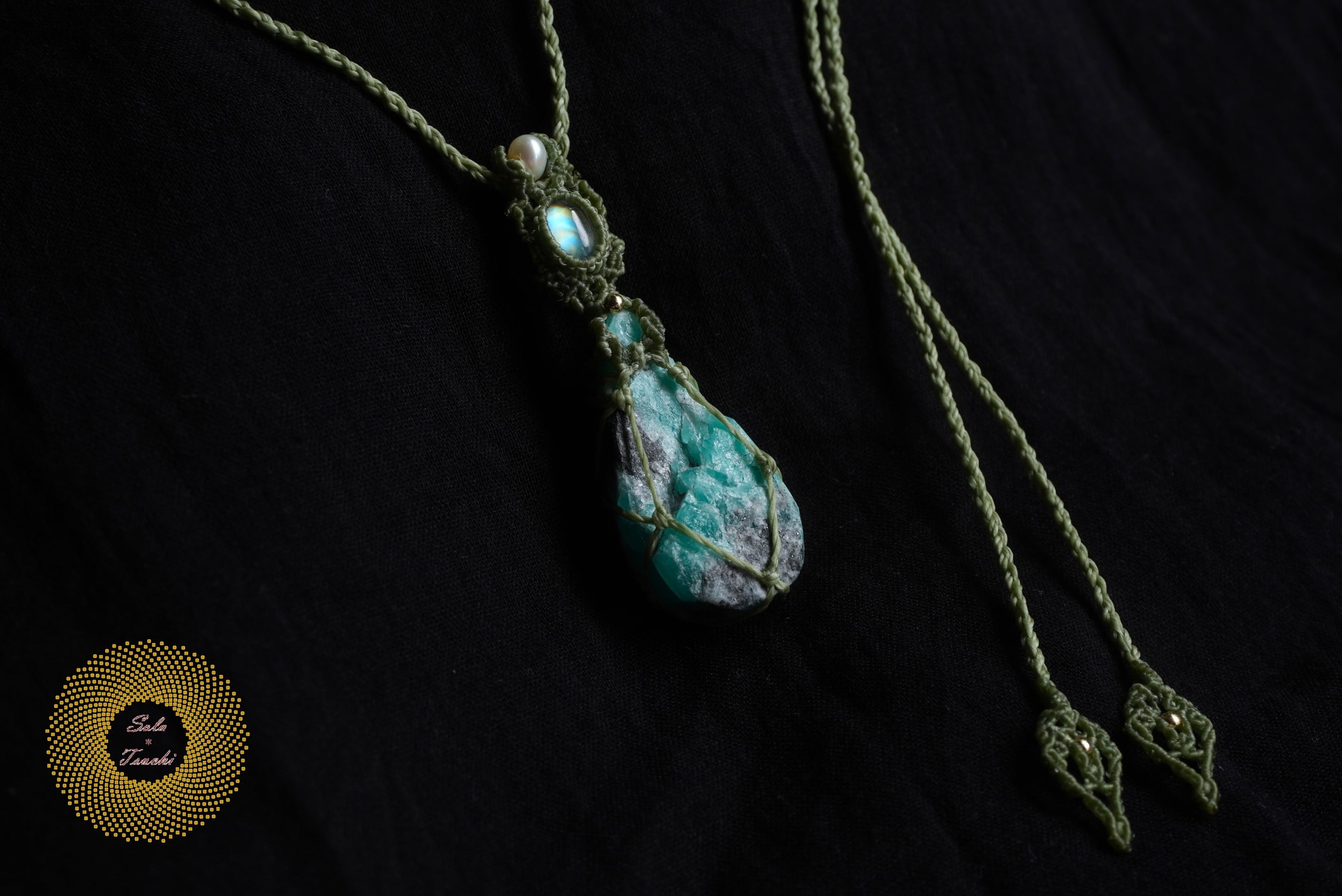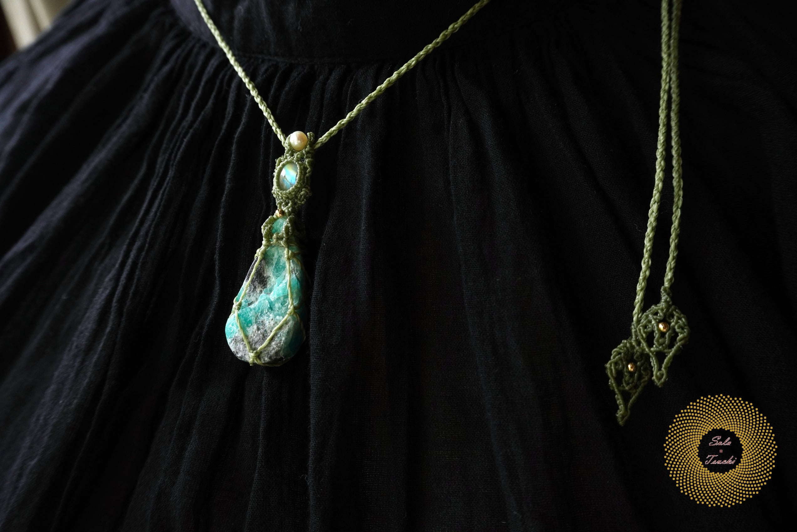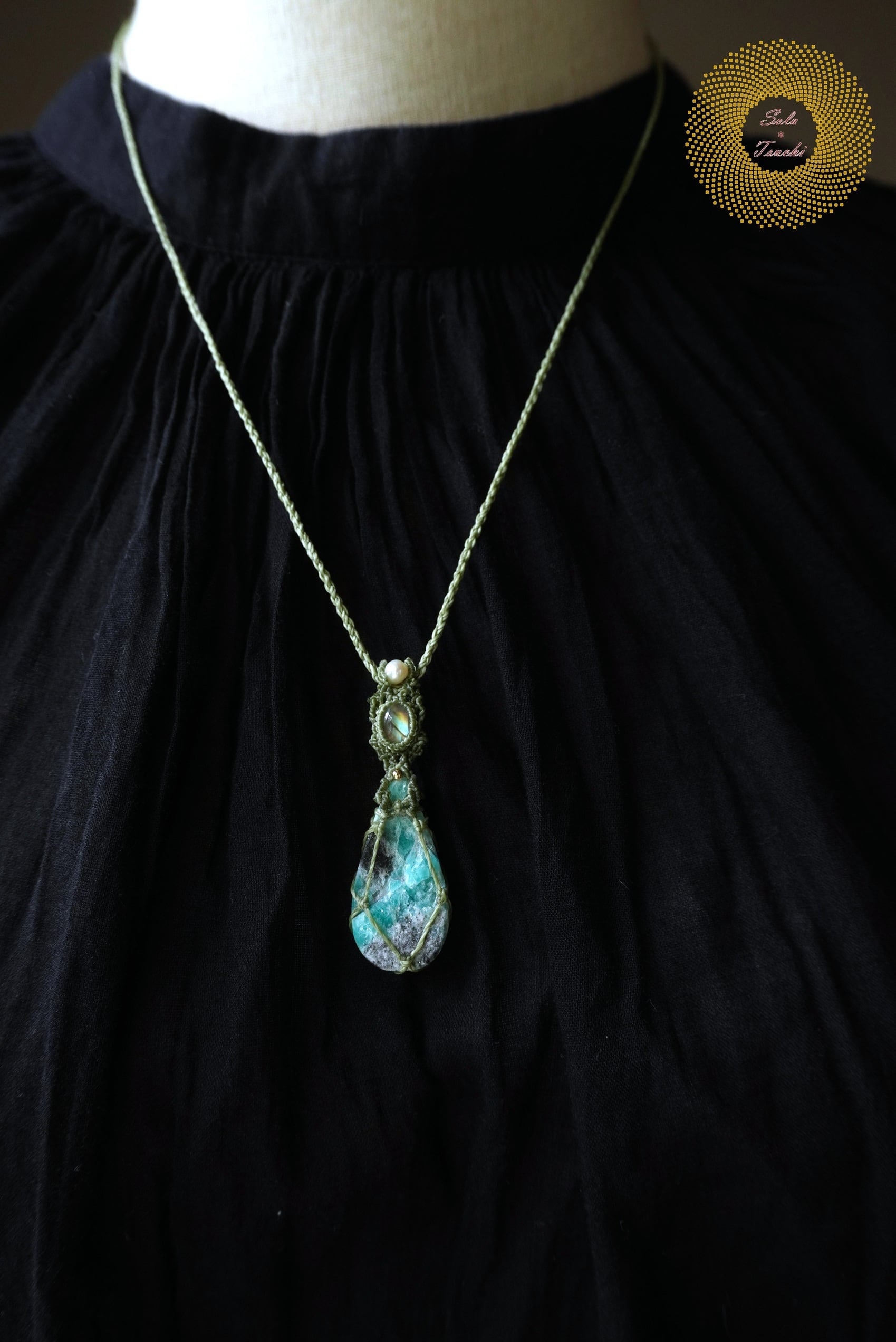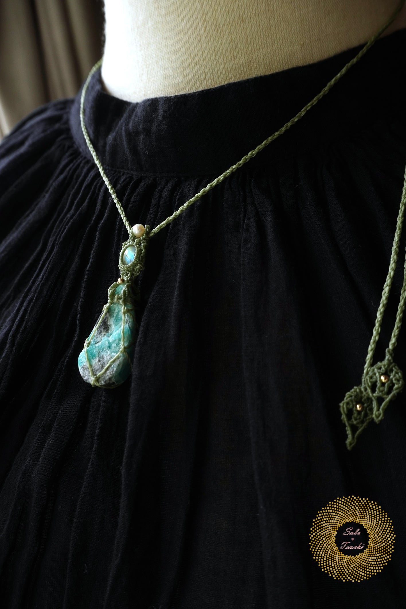 (ワックスコード)エメラルド原石とレインボームーンストーンのマクラメ編みペンダント 〜Tara〜