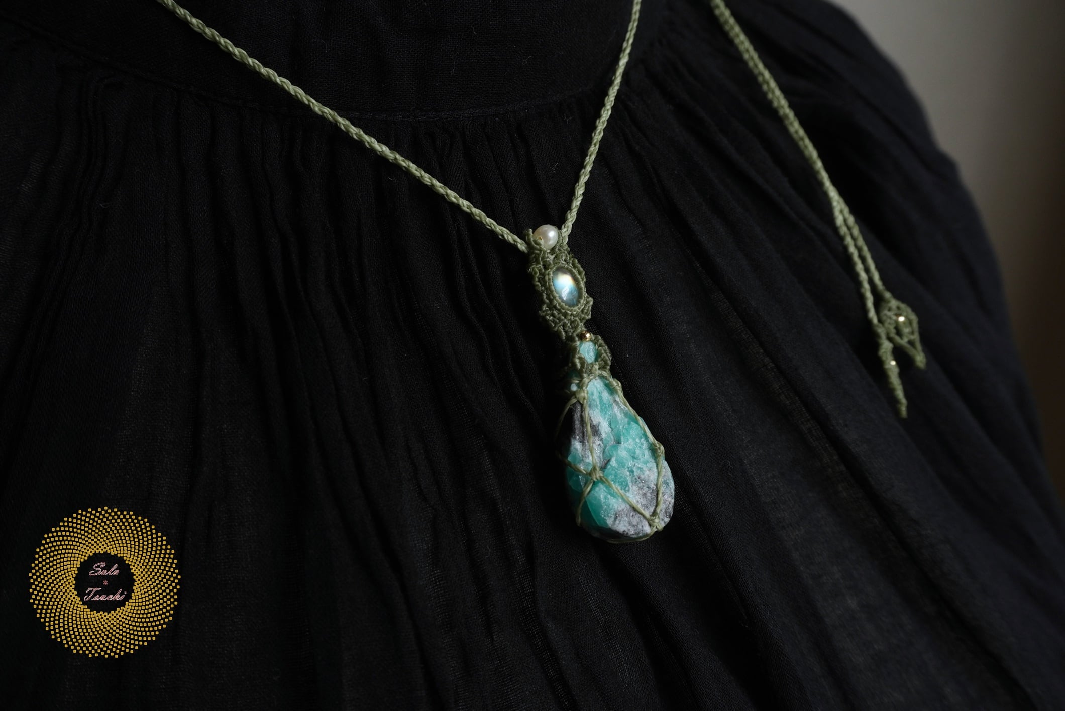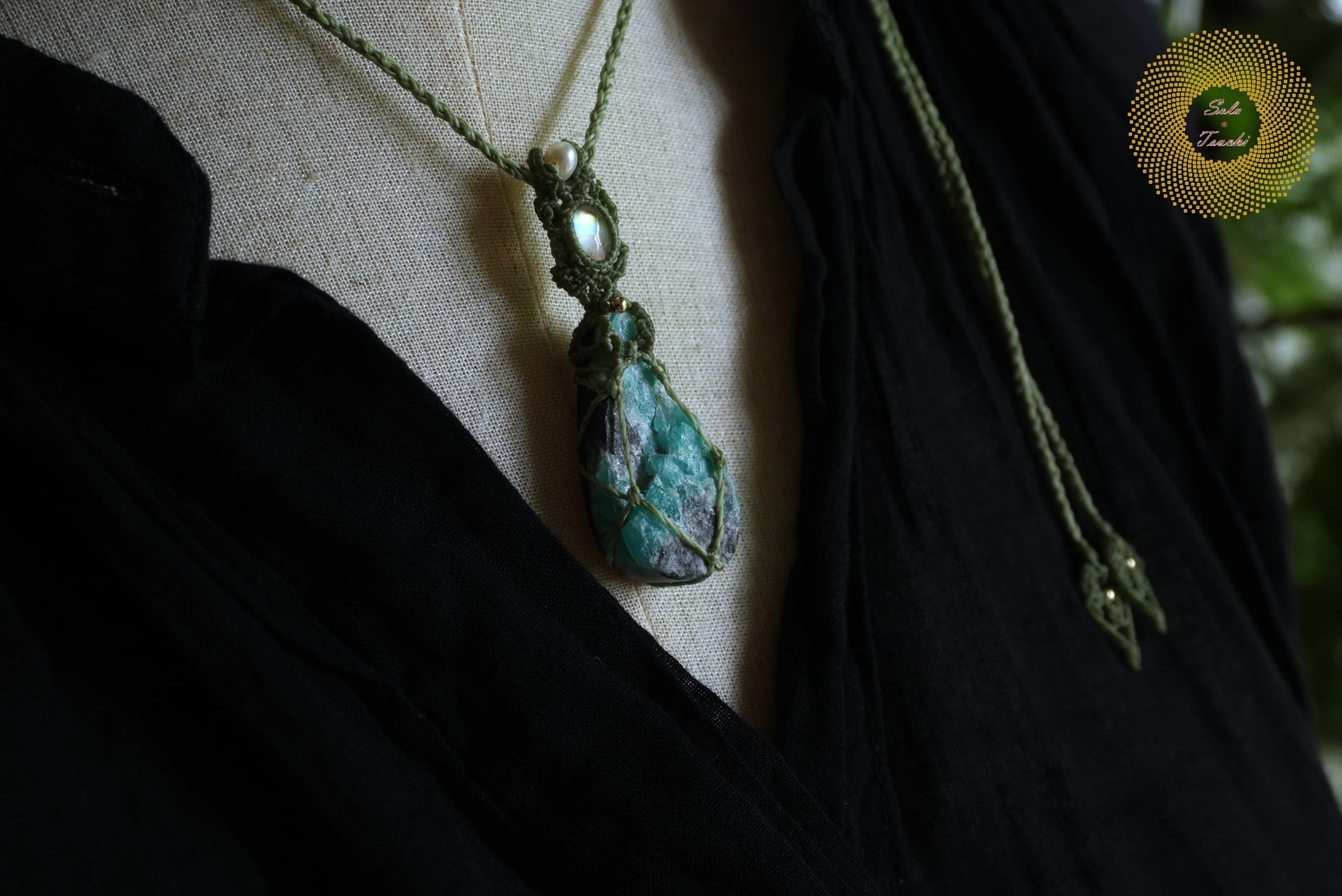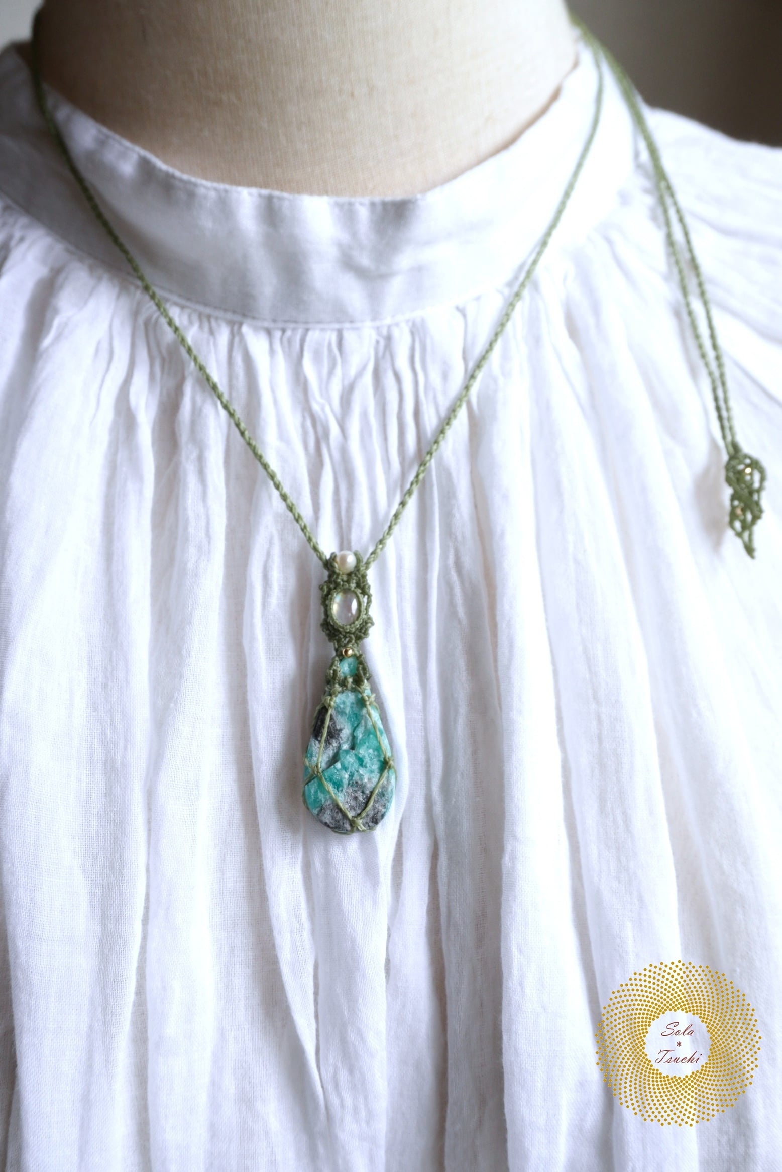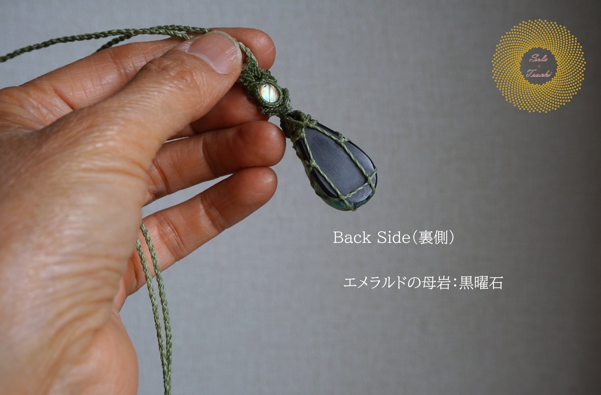 (ワックスコード)エメラルド原石とレインボームーンストーンのマクラメ編みペンダント 〜Tara〜