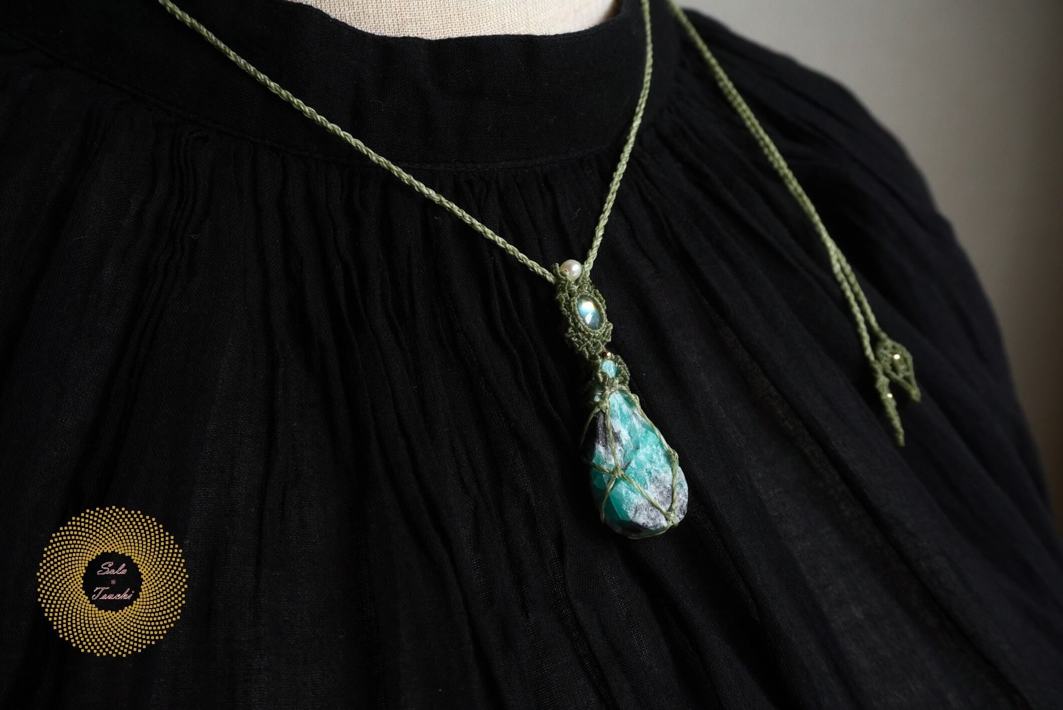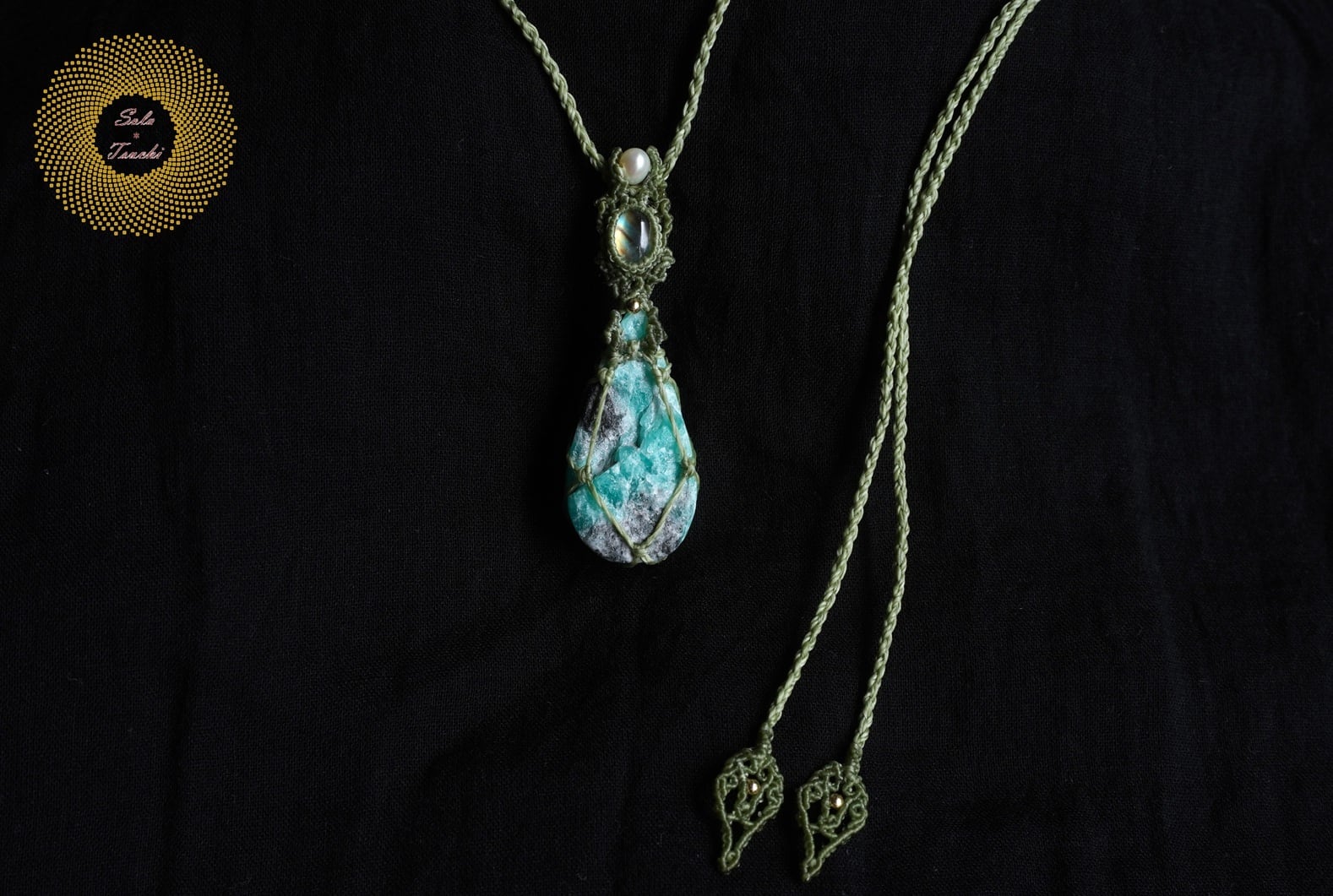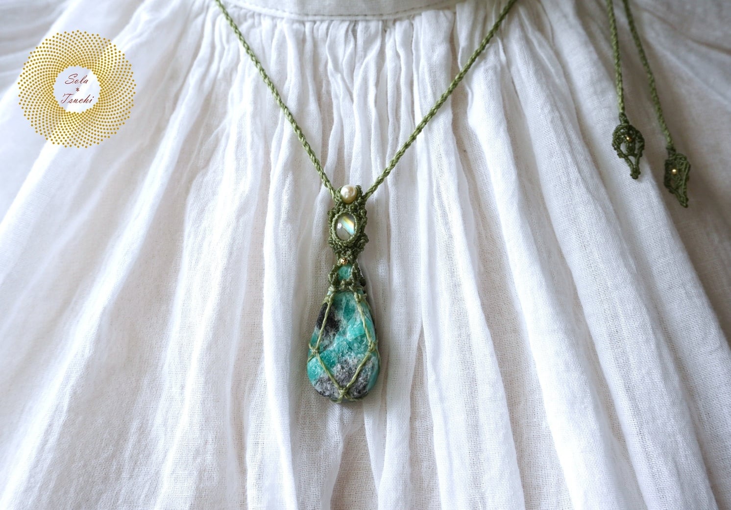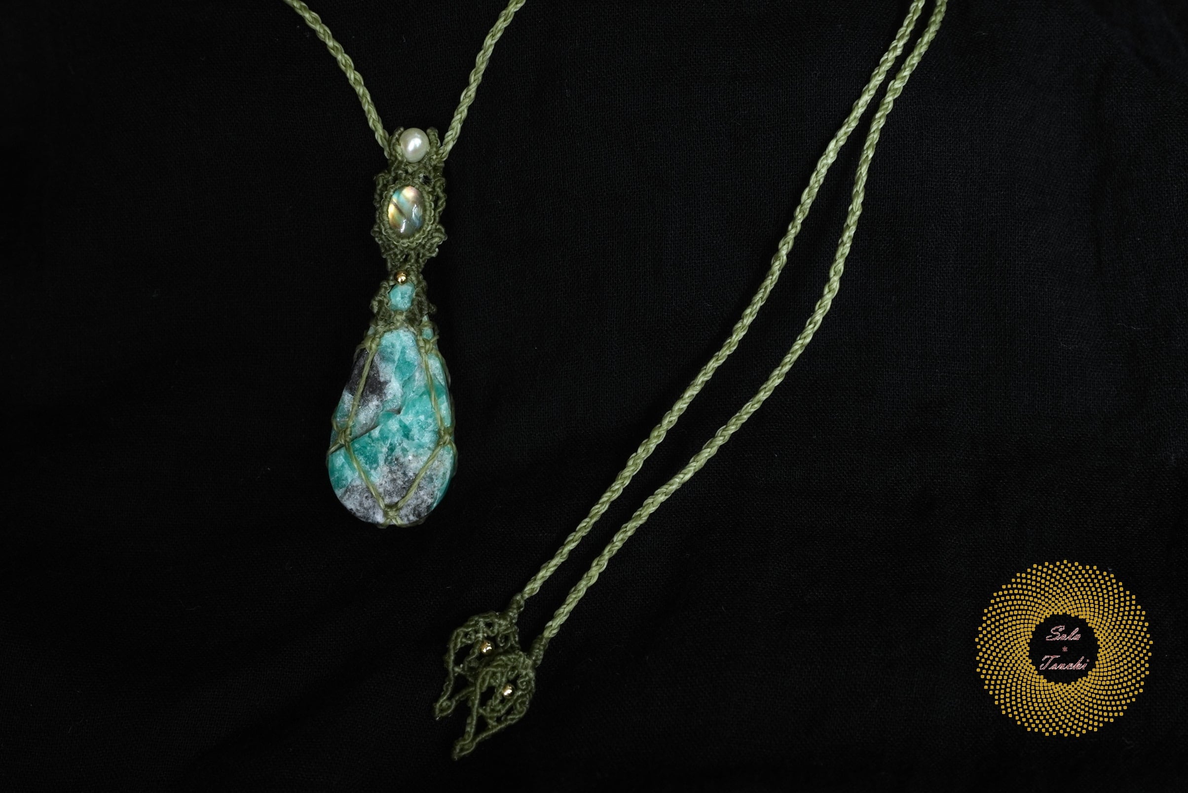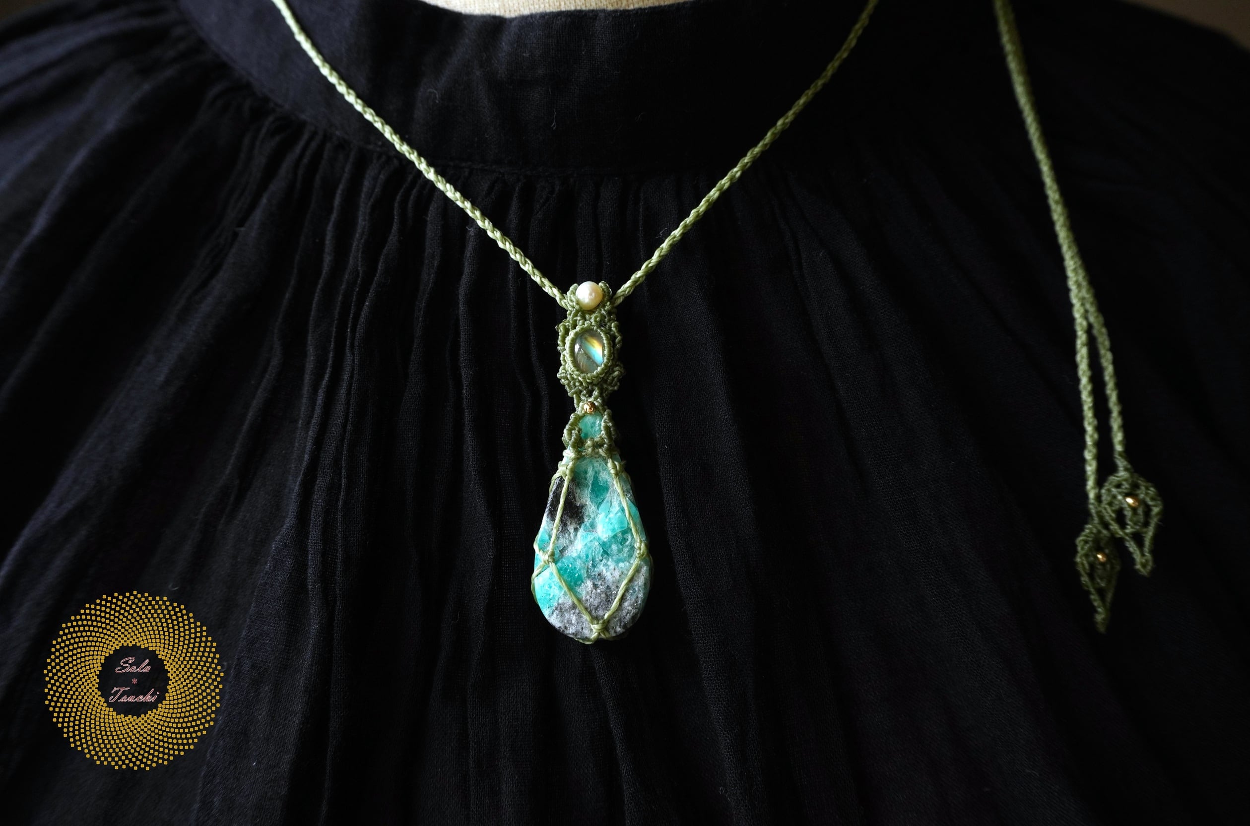 (ワックスコード)エメラルド原石とレインボームーンストーンのマクラメ編みペンダント 〜Tara〜