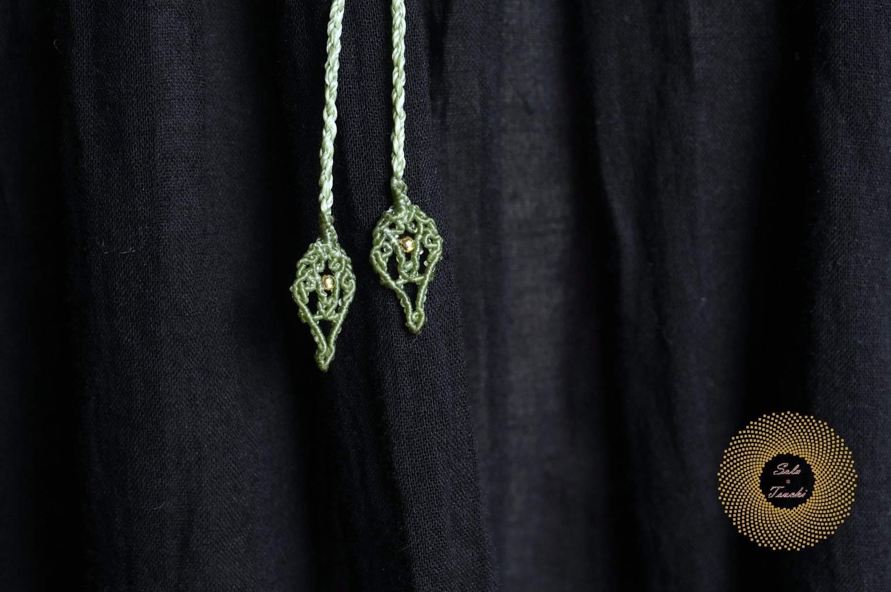 頭をくぐらせて装着し、2本をまとめている水晶(アジャスター)を