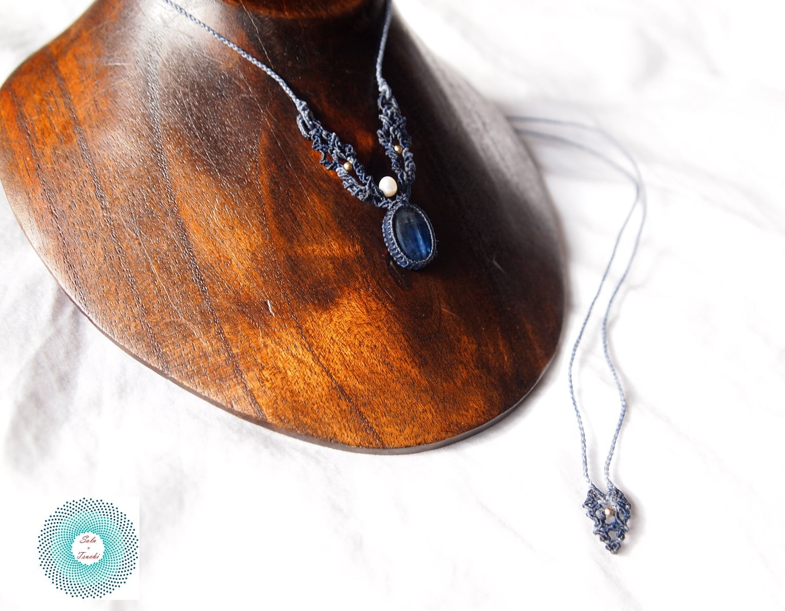 (ワックスコード)カイヤナイトと淡水パールのマクラメ編みペンダント 〜青の軌跡〜