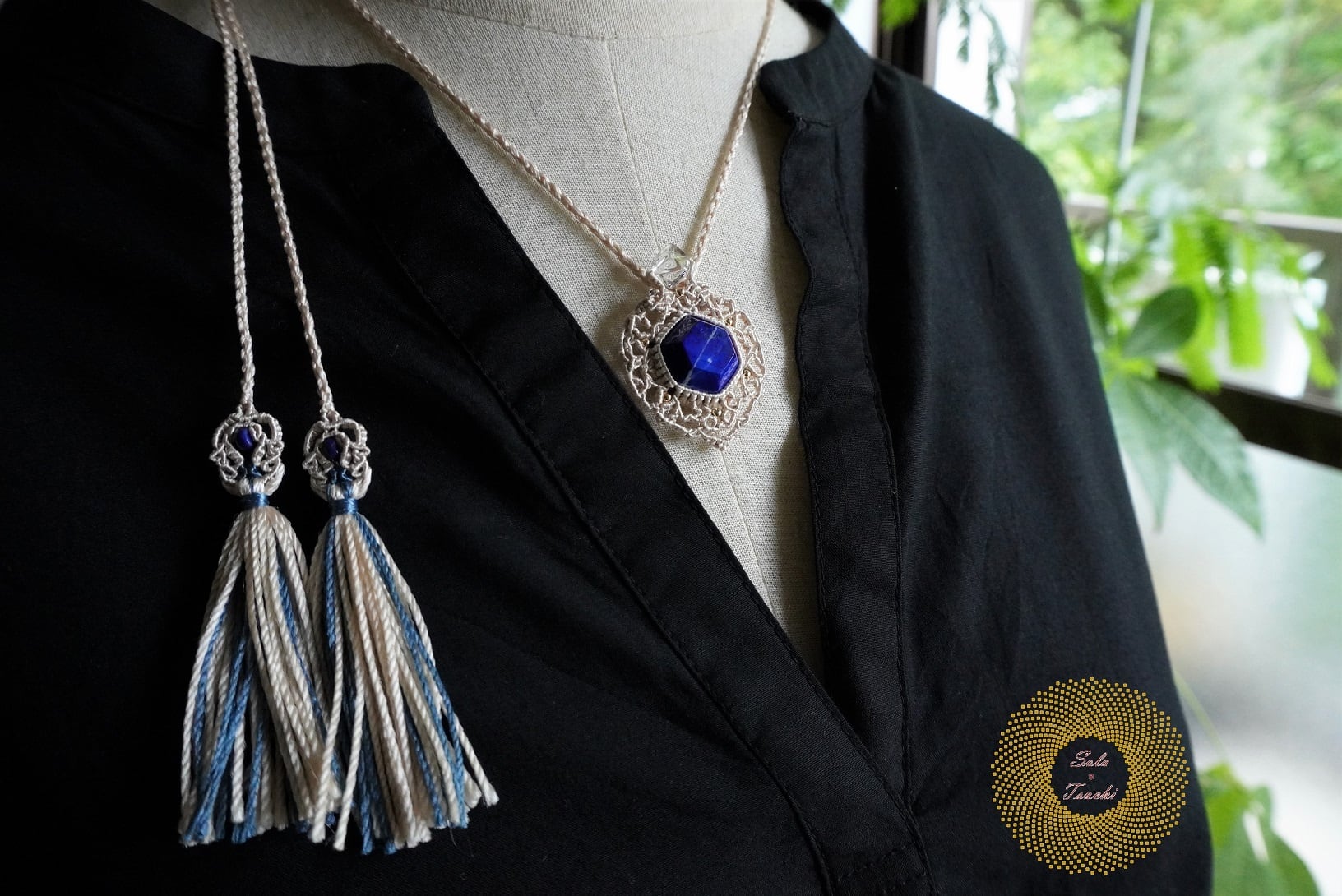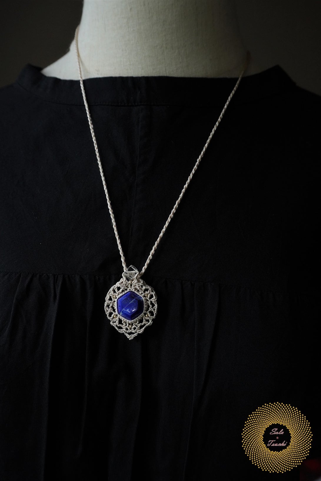 (絹糸)六角形ラピスラズリのマクラメ編みペンダント 〜Bright〜