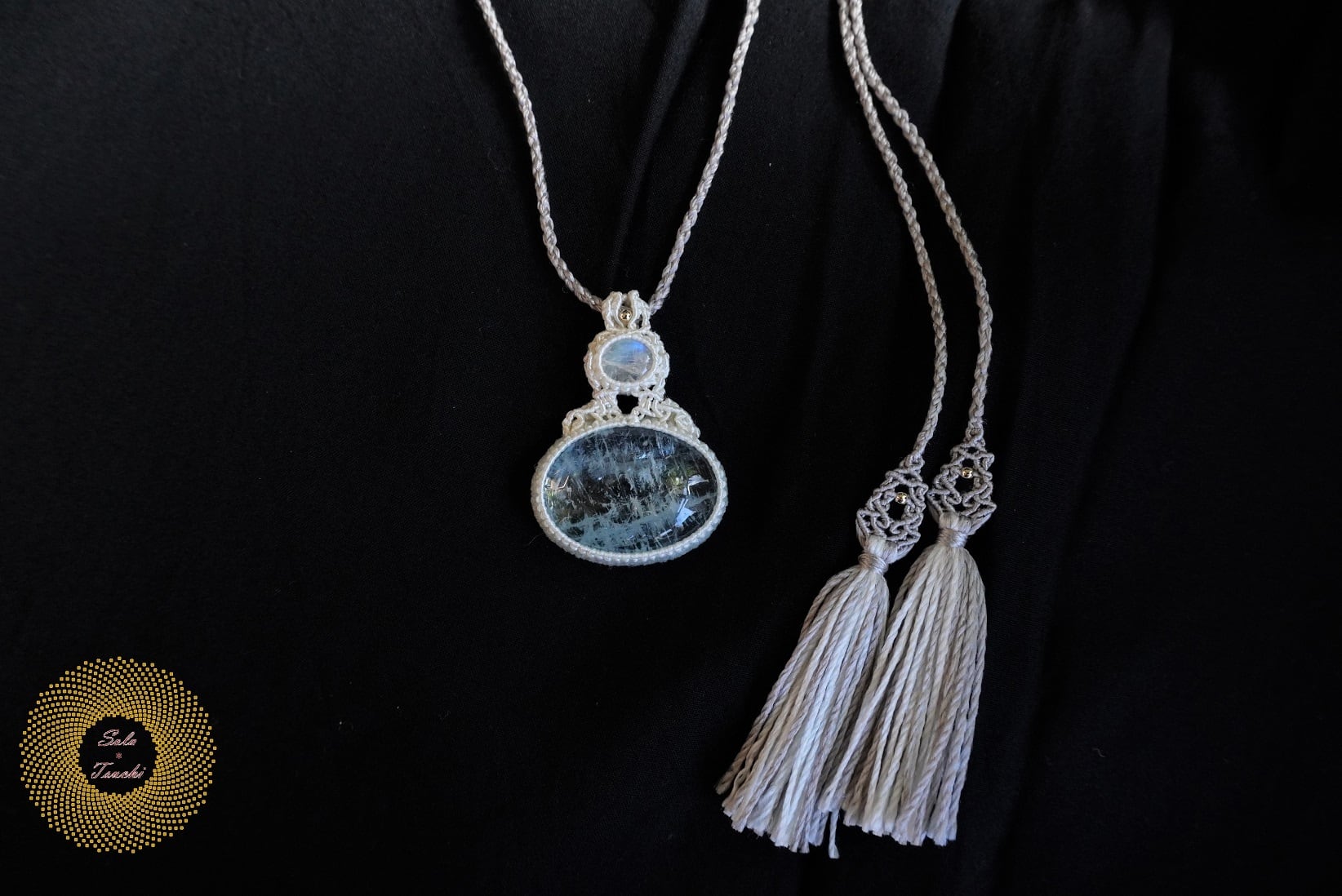 (絹糸)アクアマリンとレインボームーンストーンのマクラメ編みペンダント 〜泡を繋いで〜