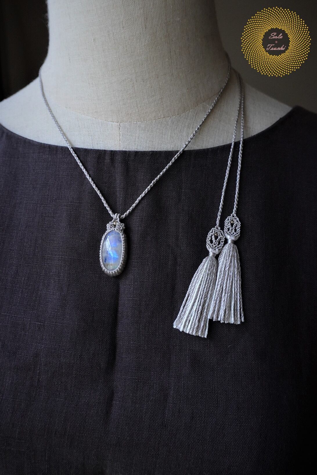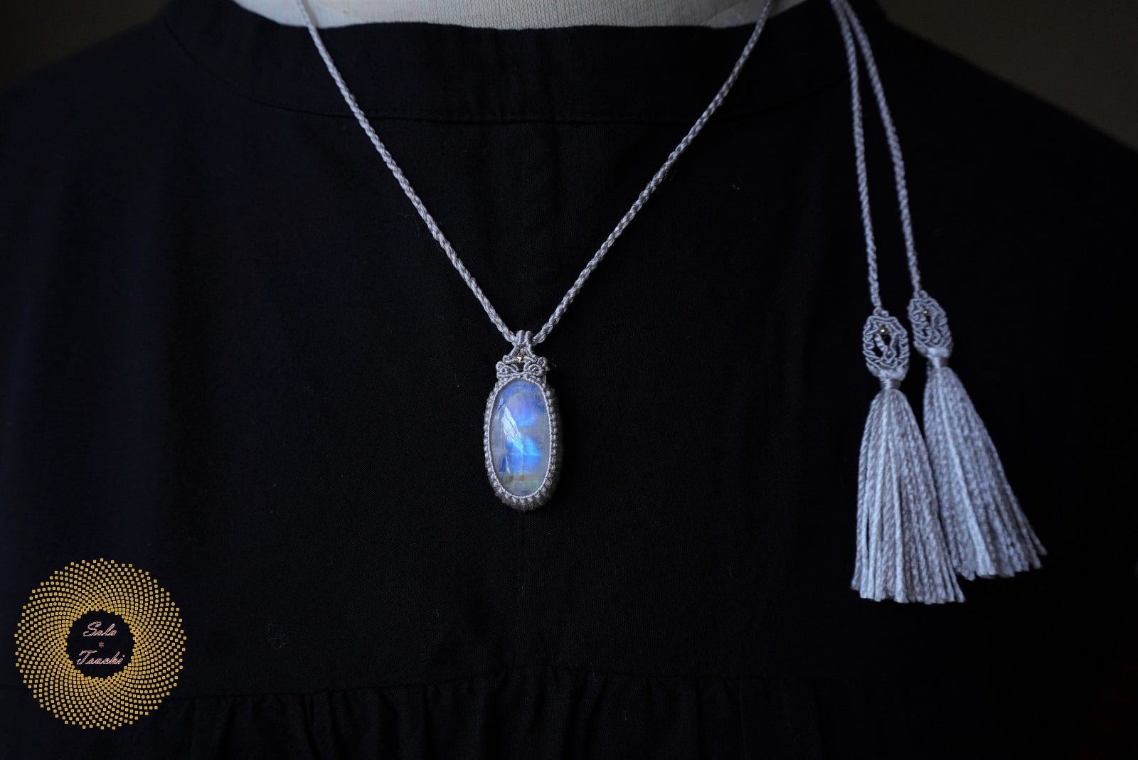 (絹糸)レインボームーンストーンの マクラメ編みペンダント 〜Fairness〜