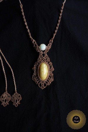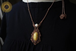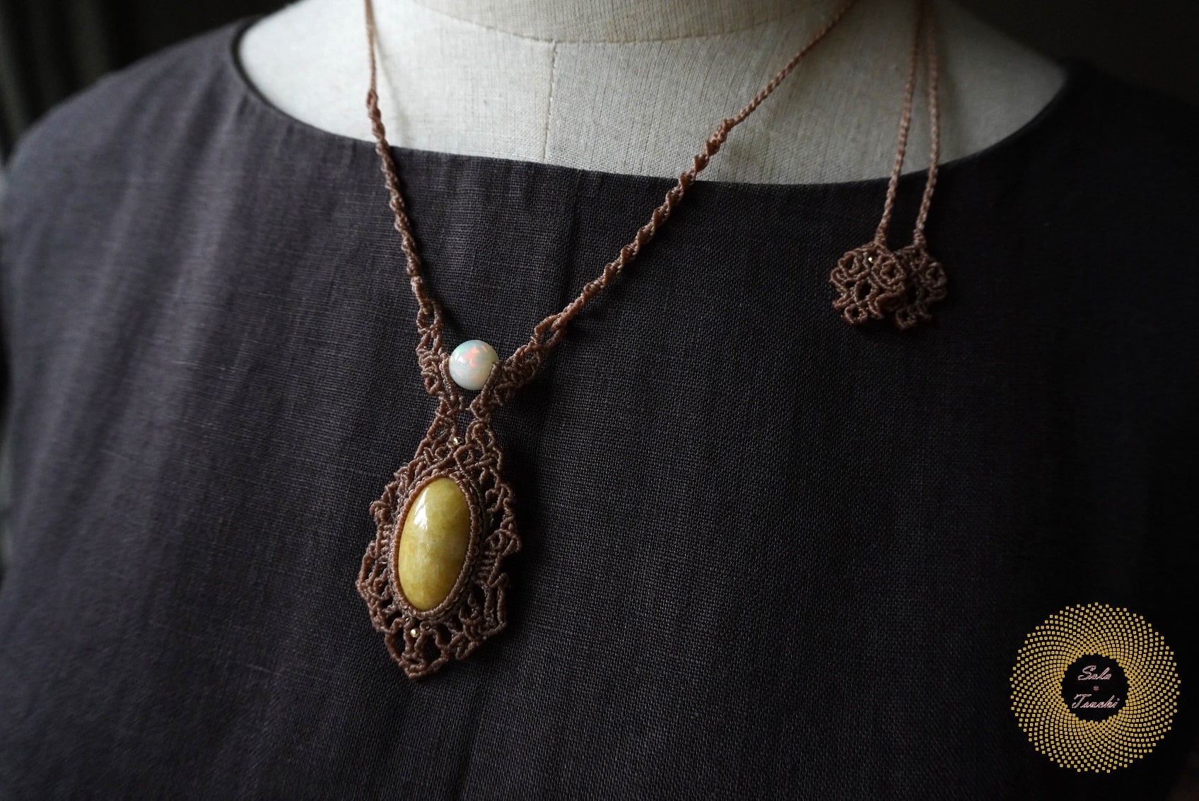 (ワックスコード)黄翡翠とホワイトオパールのマクラメ編みペンダント 〜Shining Egg〜