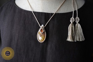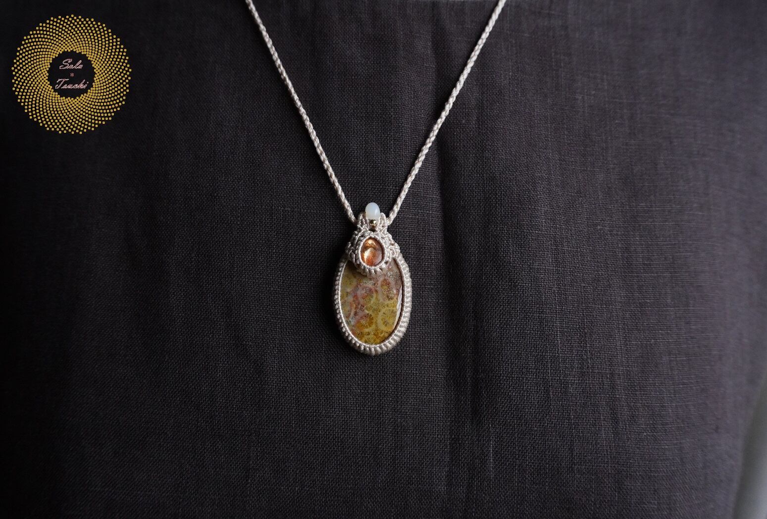 (絹糸)フォッシルコーラルとサンストーンのマクラメ編みペンダント 〜海の女神〜