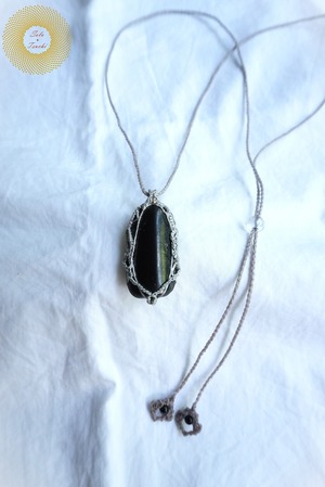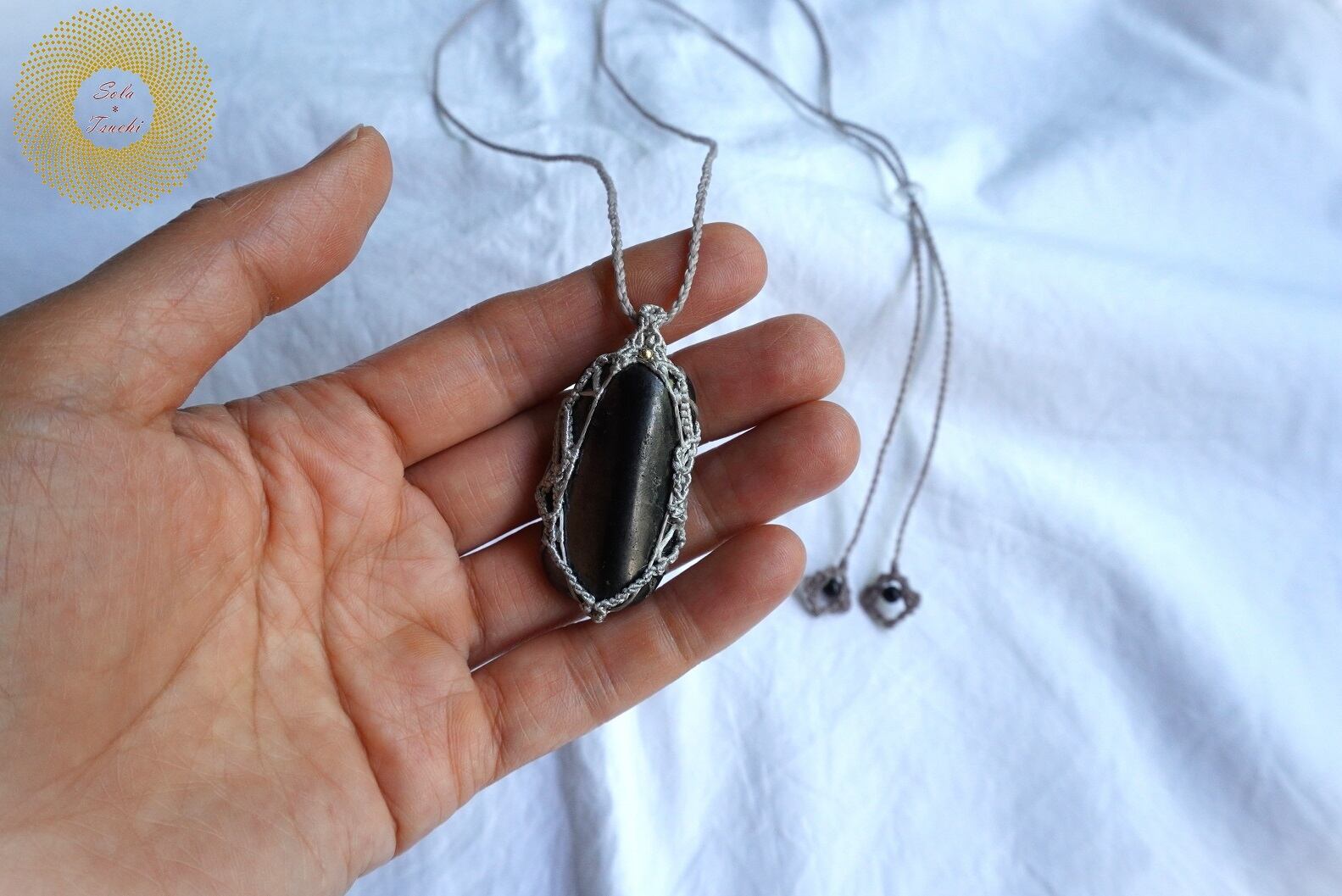 (絹糸+ワックスコード)シュンガイトのマクラメ編みペンダント 〜Ally〜