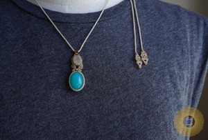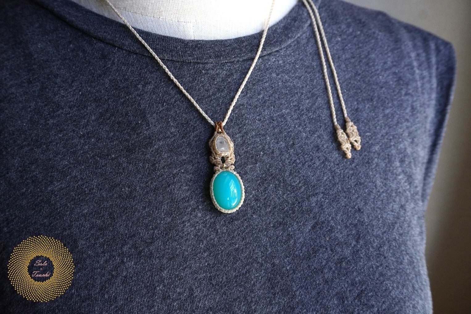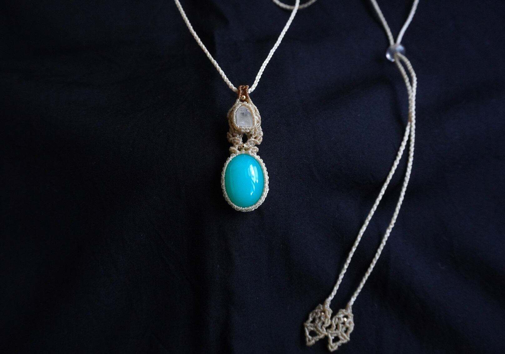 (ワックスコード)シーブルーカルセドニーと水晶原石のマクラメ編みペンダント 〜広く溶け合って調和する〜