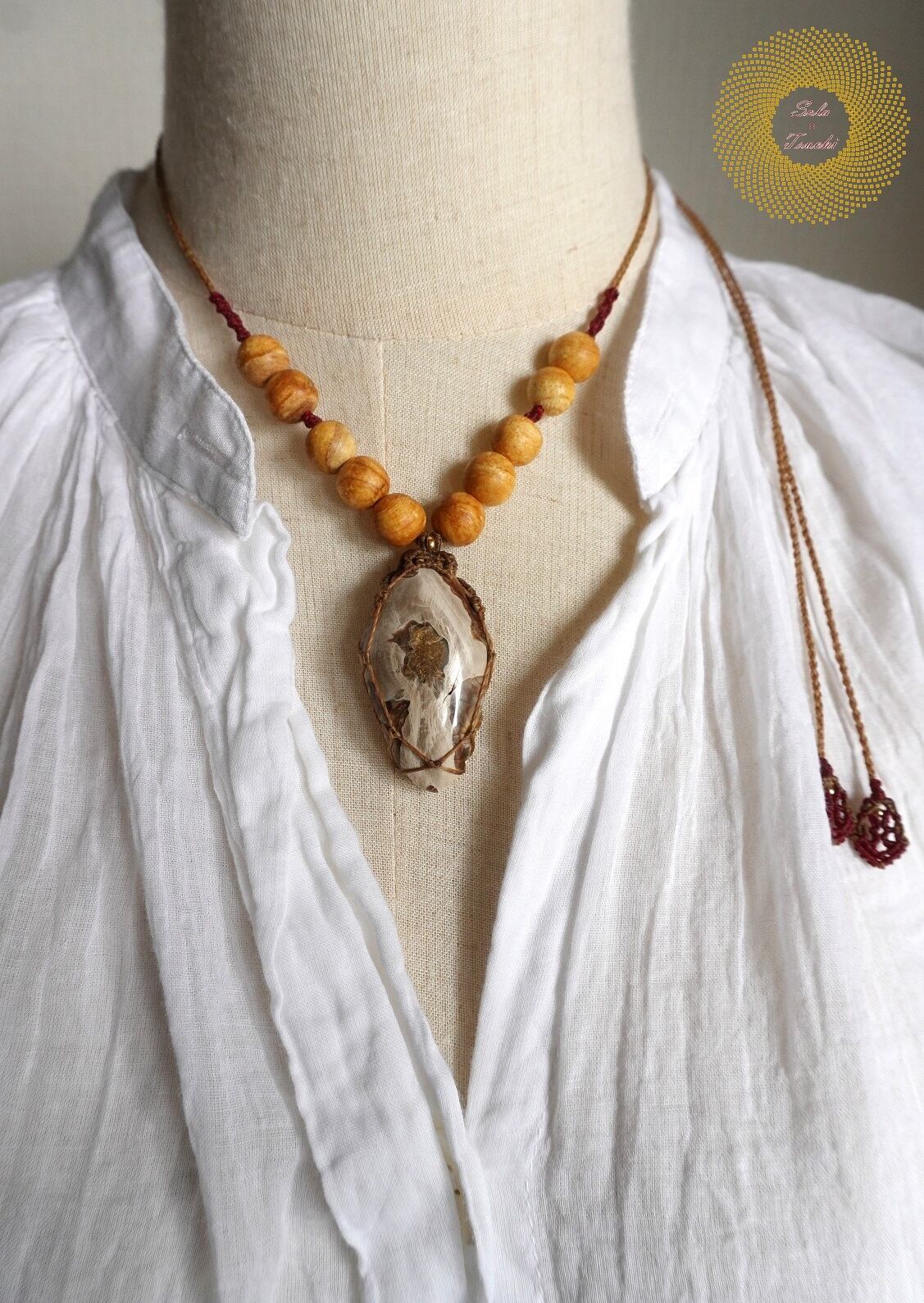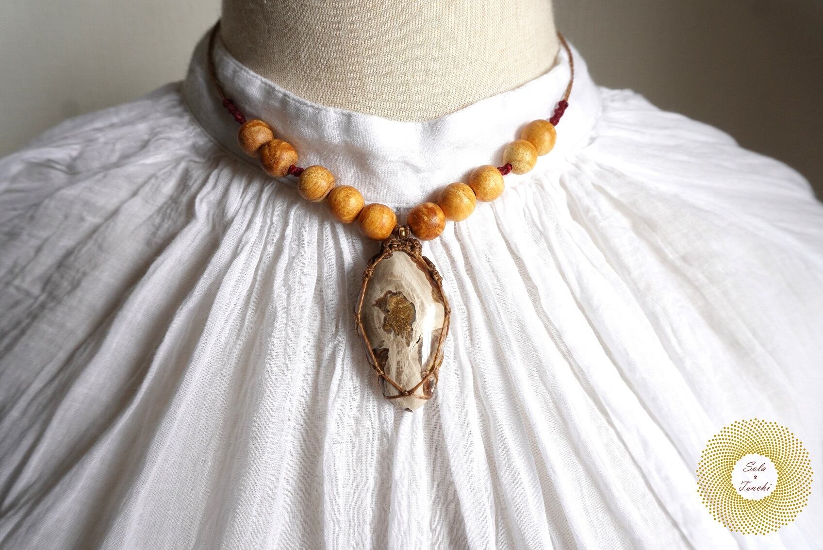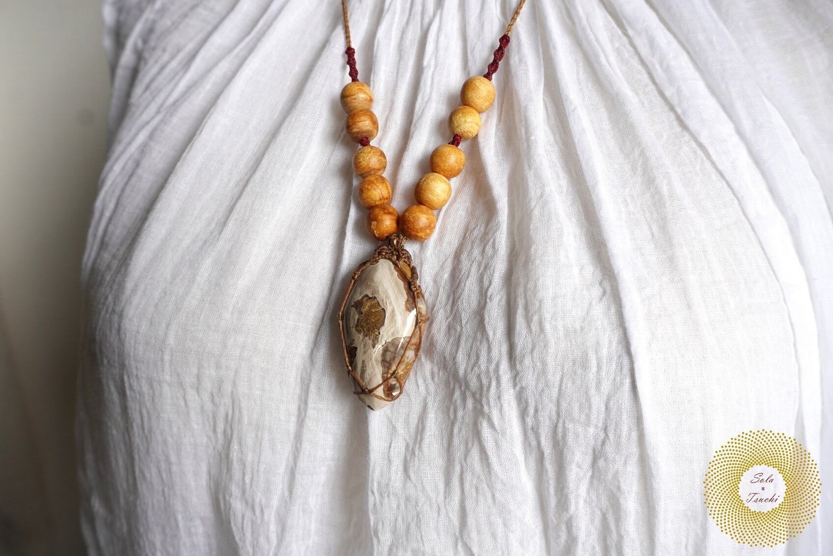 (ワックスコード)ペトリファイドウッドとパロサントのマクラメ編みペンダント 〜Live〜