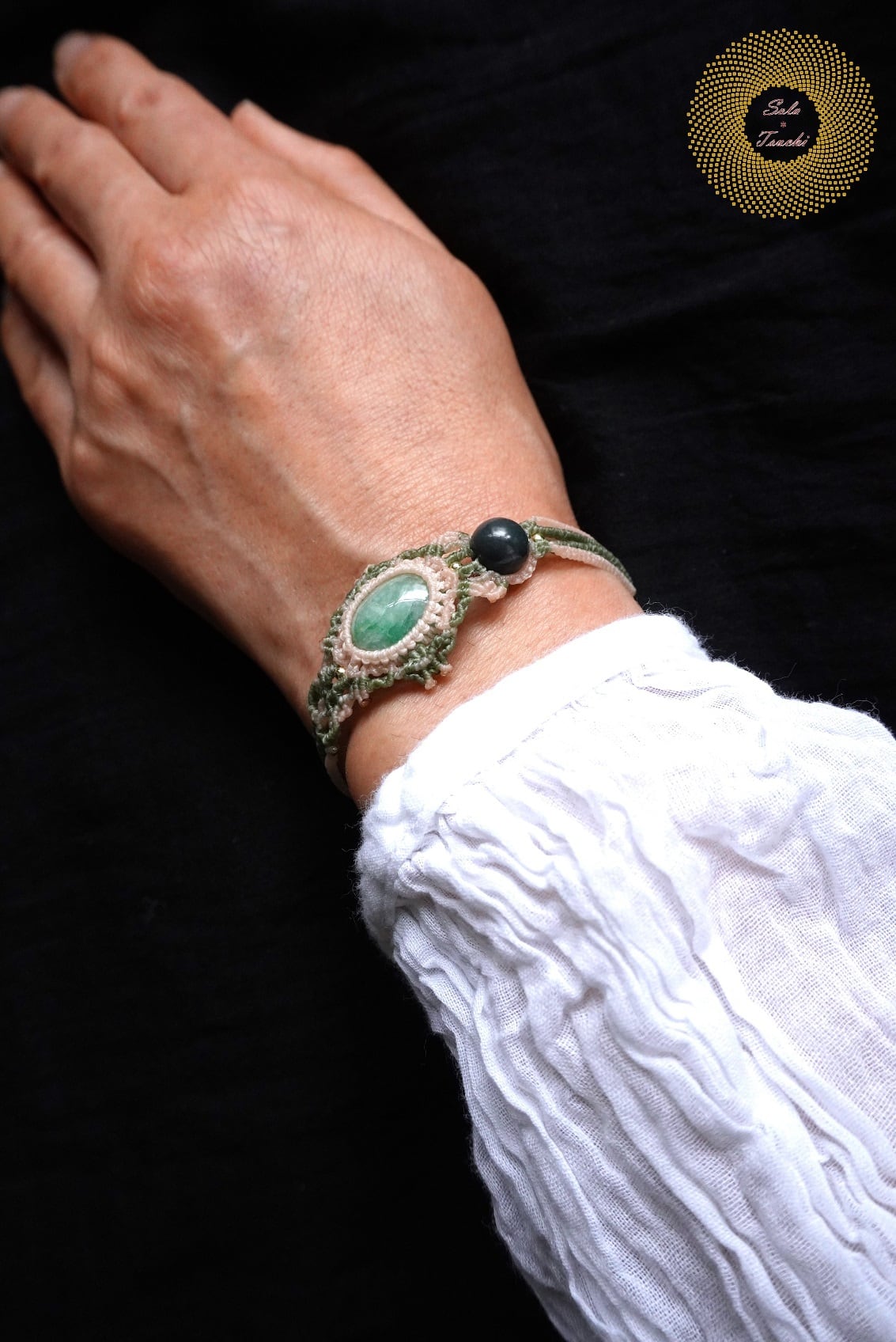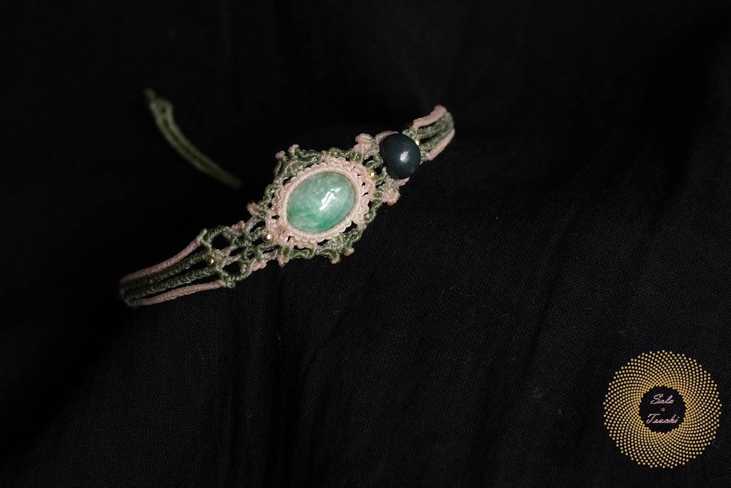 (ワックスコード)ミャンマー産翡翠と神居古潭石のマクラメ編みブレスレット 〜天へ〜